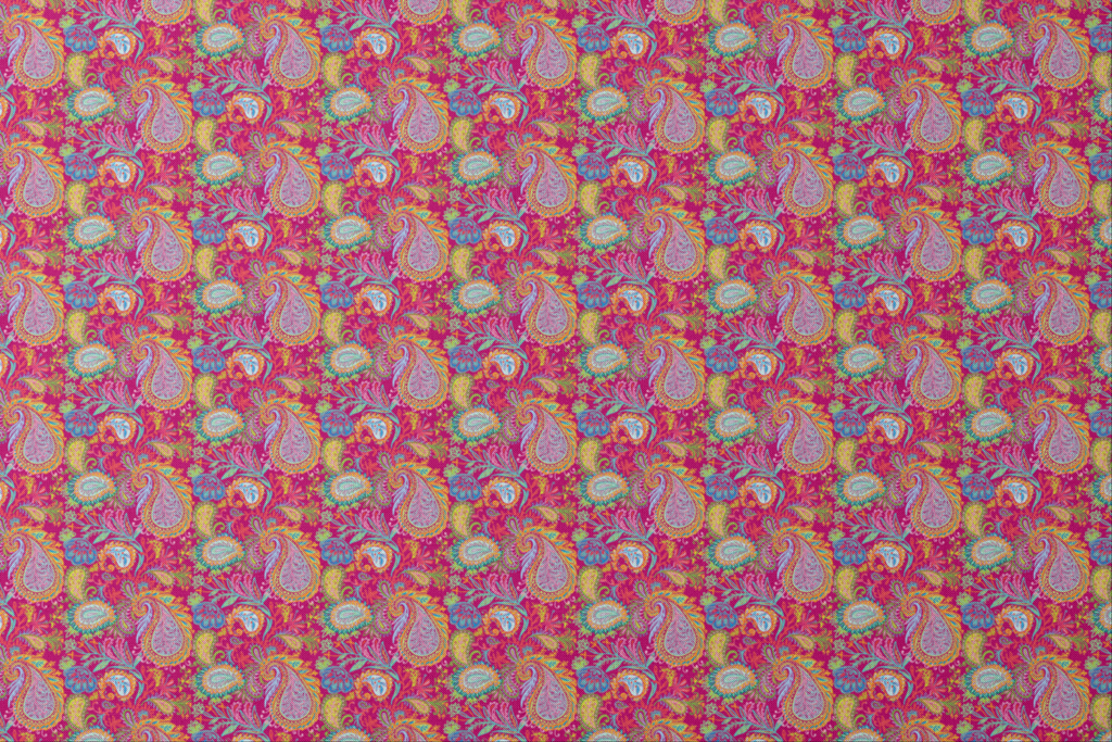Vibrant paisley motifs dance across a rich magenta background in this eye-catching design. Intricately detailed teardrops in lavender, lime green, and sky blue swirl among coral-colored foliage and sunny yellow accents, creating a lush botanical fantasy. The bold color combination delivers both warmth and energy, perfect for statement pieces that demand attention. This fabric would make stunning accent pillows or a show-stopping tote bag that turns heads wherever you go.