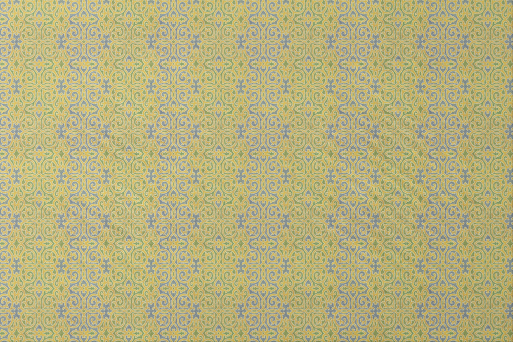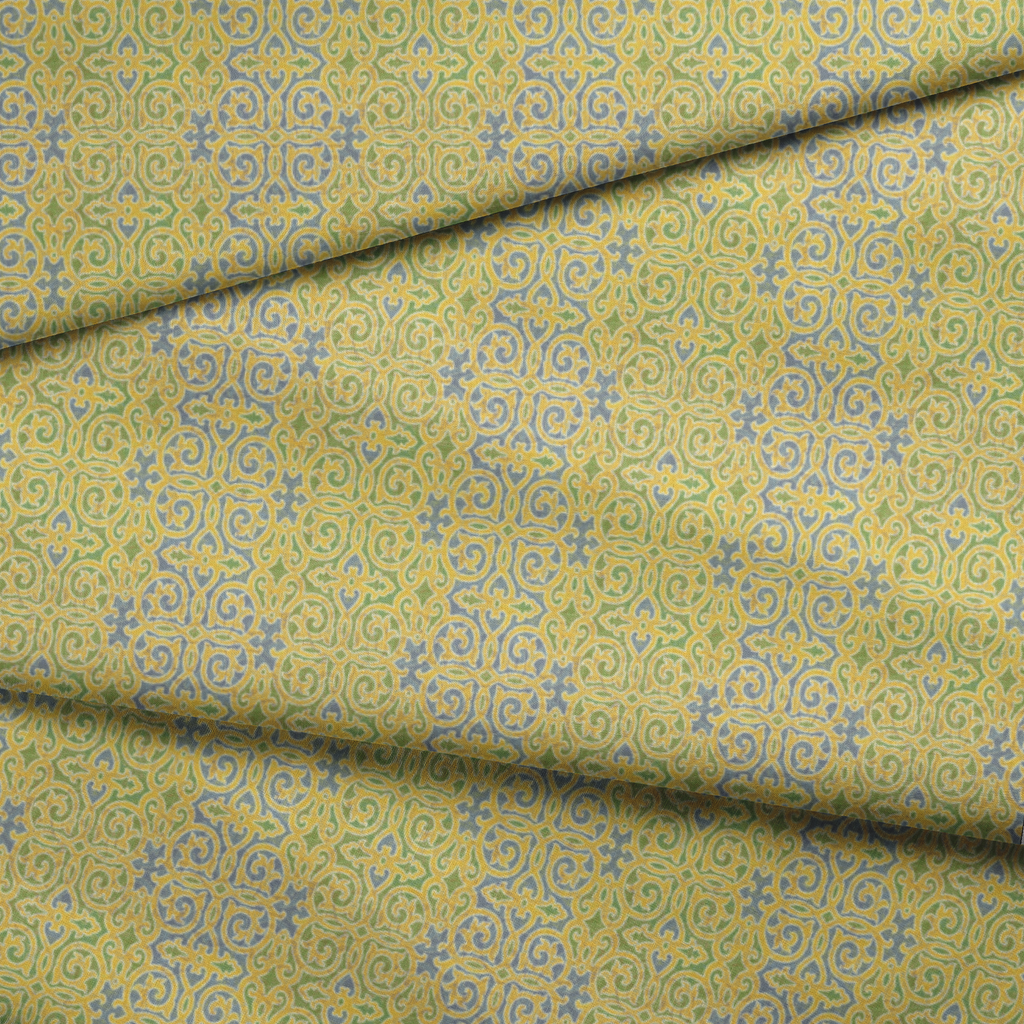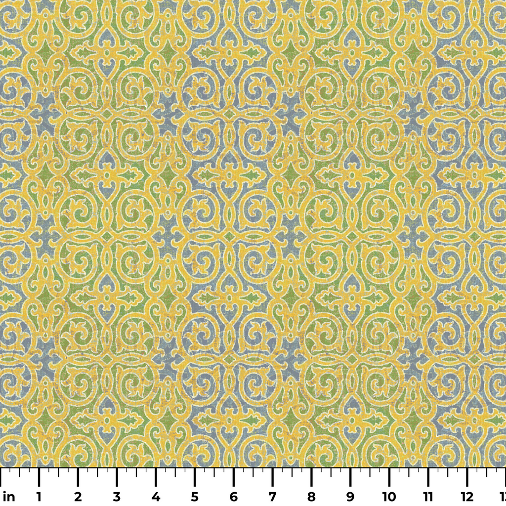 Intricate scrollwork dances across this fabric in a Mediterranean-inspired palette of sunny yellow, slate blue, and olive green. The ornate damask-style pattern has a slightly weathered, textural appearance that gives it a handcrafted, vintage feel. Perfect for throw pillows that add a splash of color to neutral furniture or as accent curtains in a sunroom where the yellow tones will catch the light beautifully.