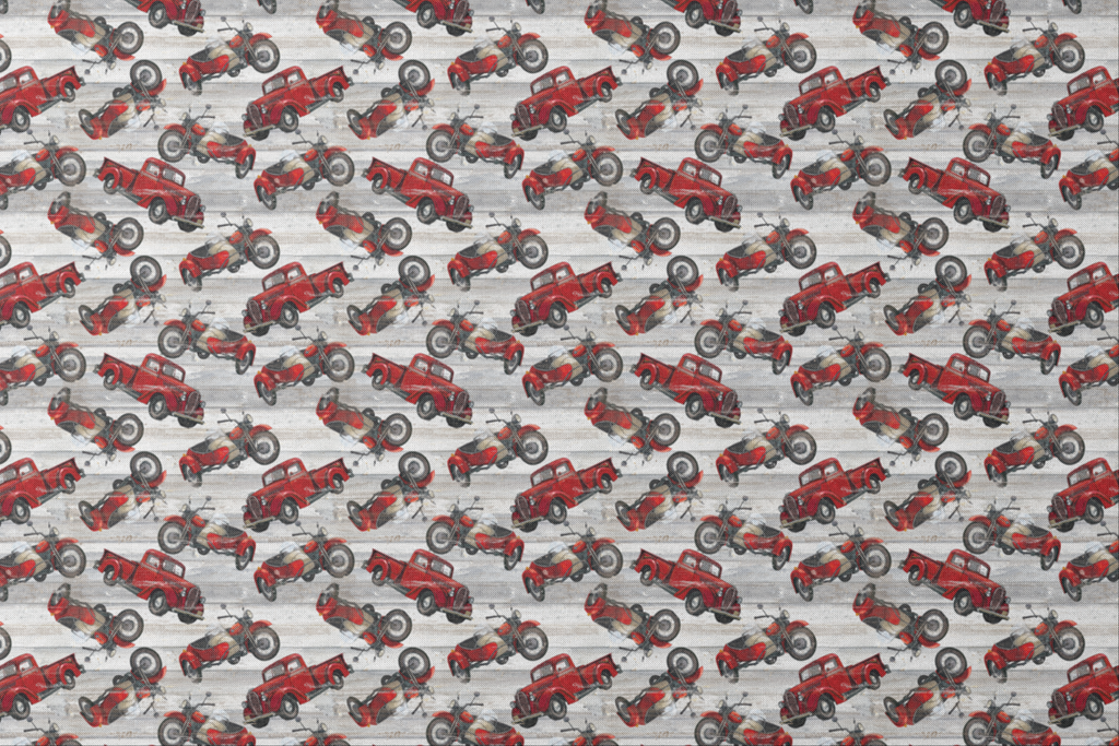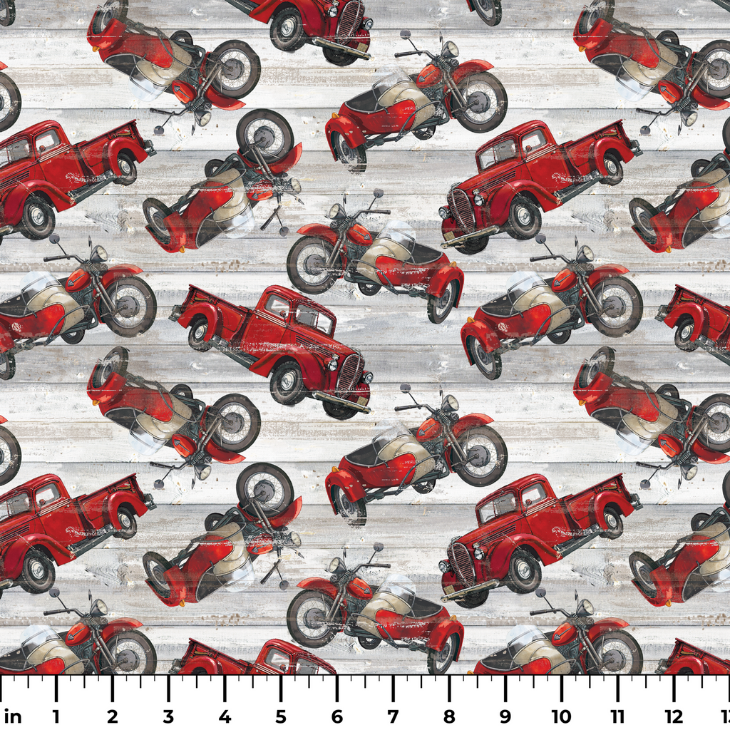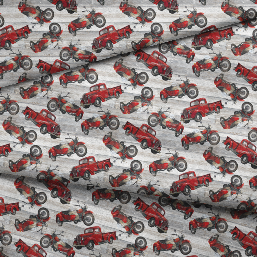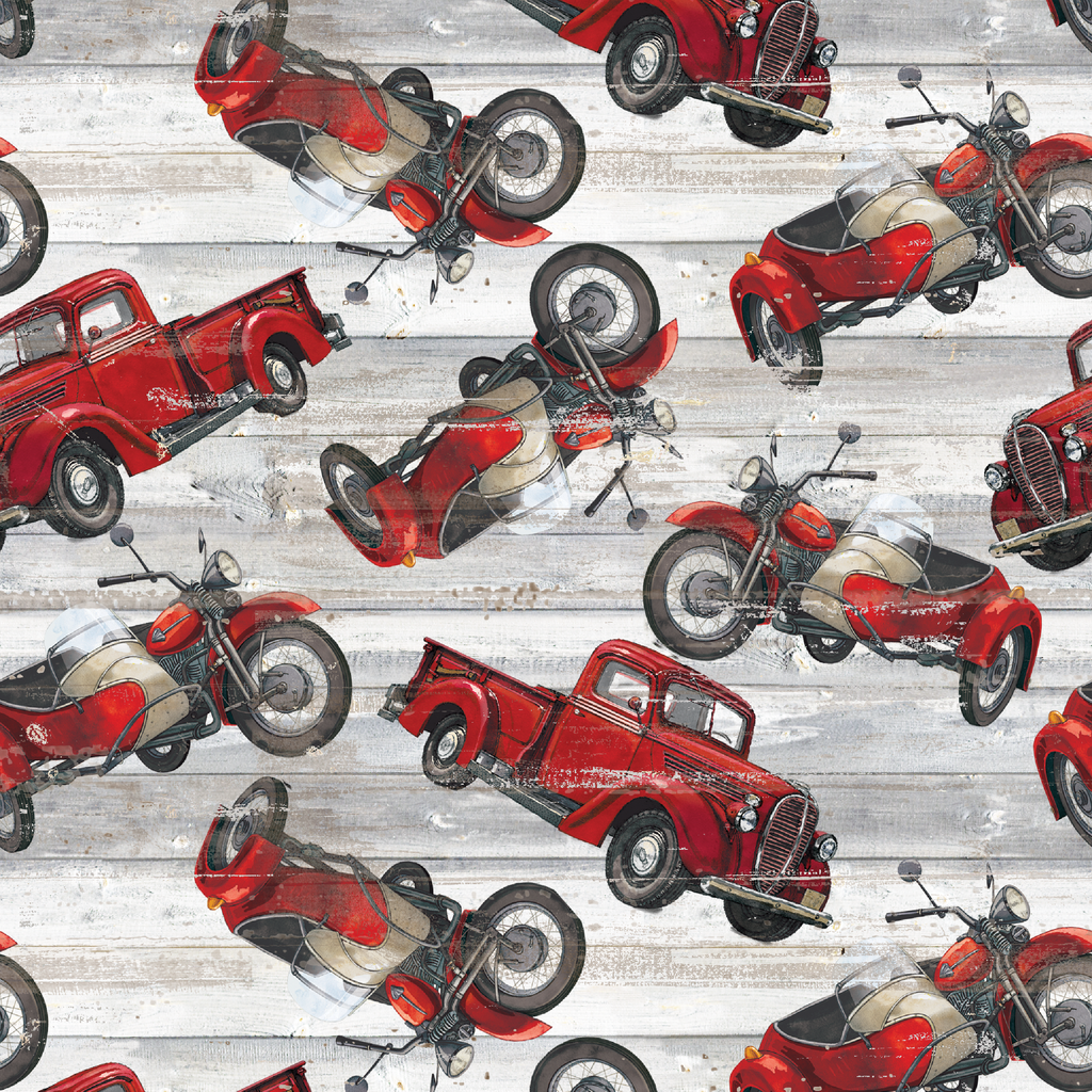 Vibrant cherry-red vintage motorcycles with sidecars and classic pickup trucks zoom across a weathered wood plank background in this nostalgic motor-themed design. The striking contrast between the rich crimson vehicles and the distressed gray-white wooden backdrop creates a rustic yet bold visual appeal. Perfect for a man cave pillow project or crafting a unique gear-head's storage bin liner that sparks conversation.