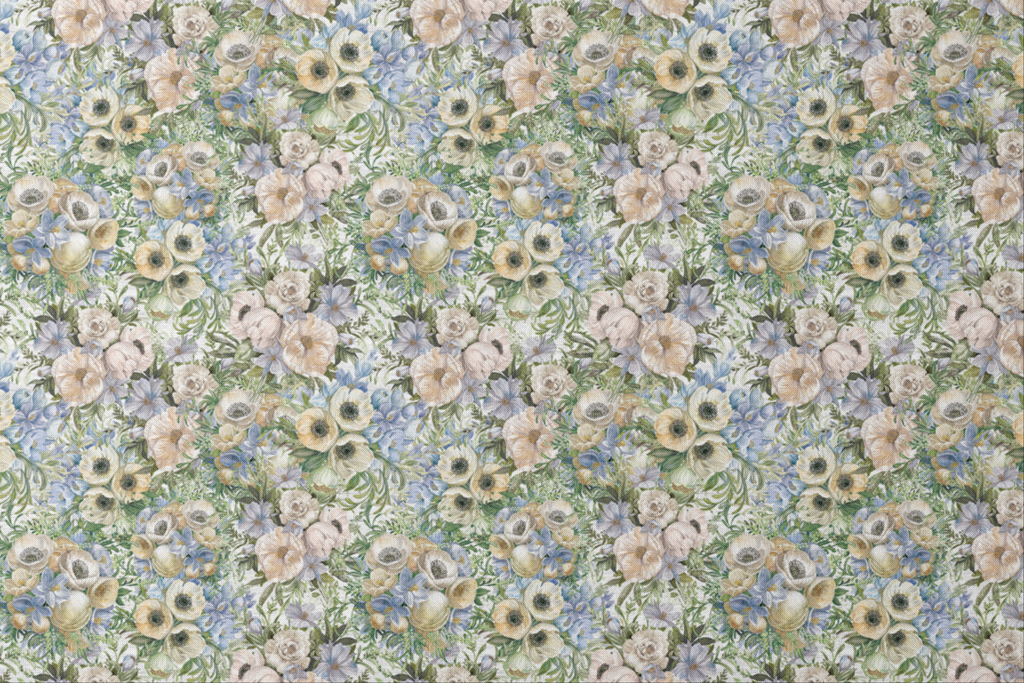 An enchanting garden of delicate blooms flourishes across this fabric in a palette of periwinkle blue, cream, and soft buttercream yellow. Watercolor-style anemones with inky black centers mingle with dainty blue flowers and lush greenery, creating a dreamy meadow effect that feels both vintage and timeless. This botanical treasure would transform into stunning pillow covers for a sunroom or make an elegant tablecloth for spring gatherings.