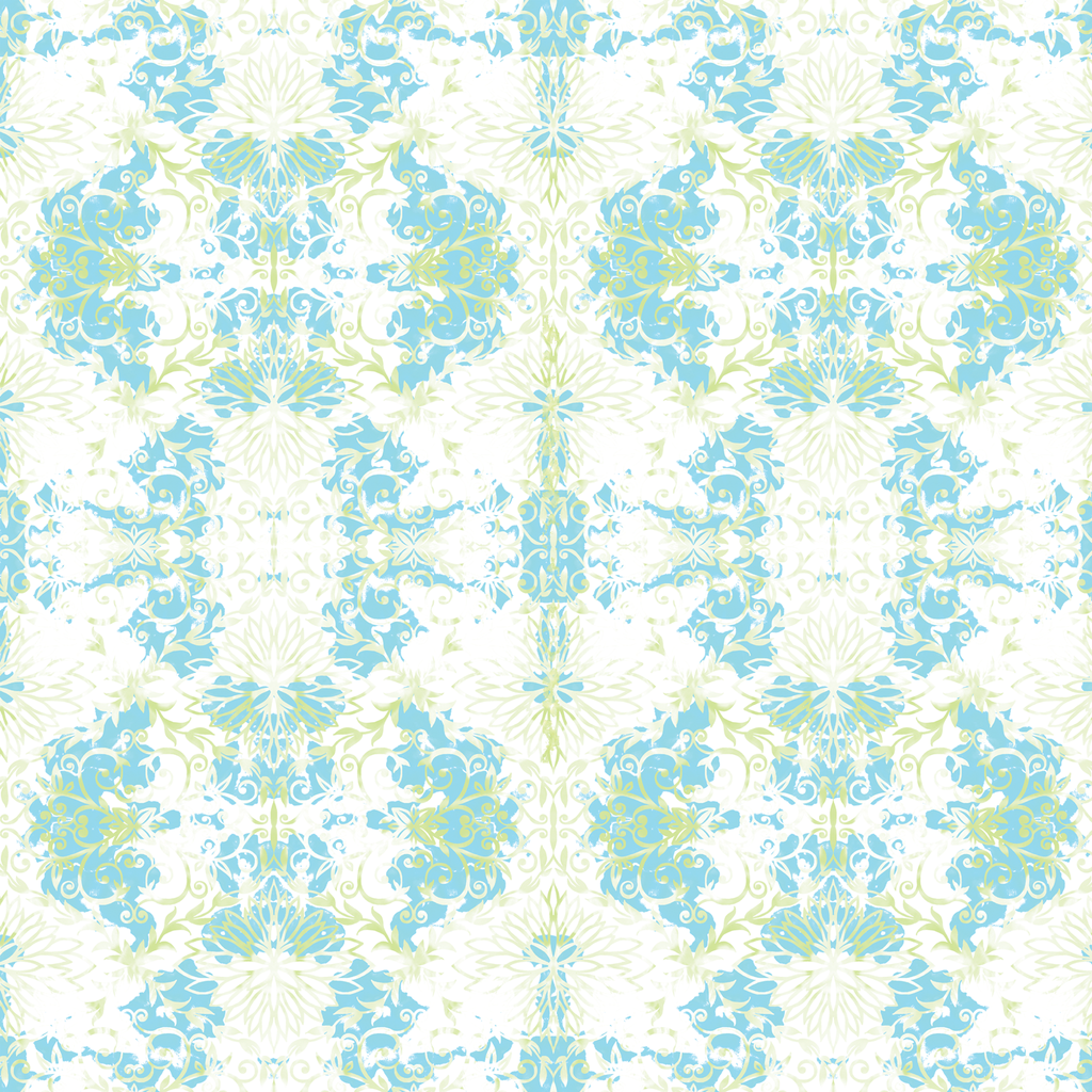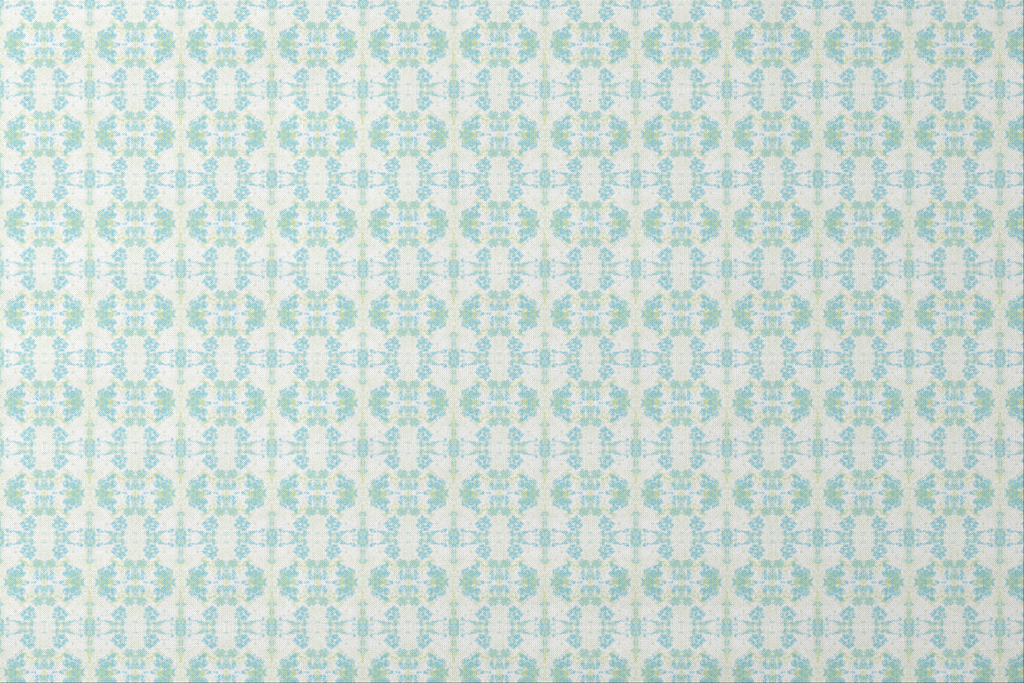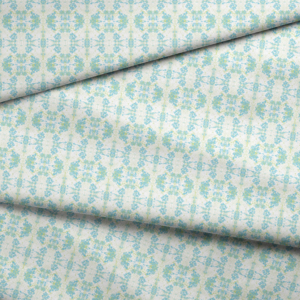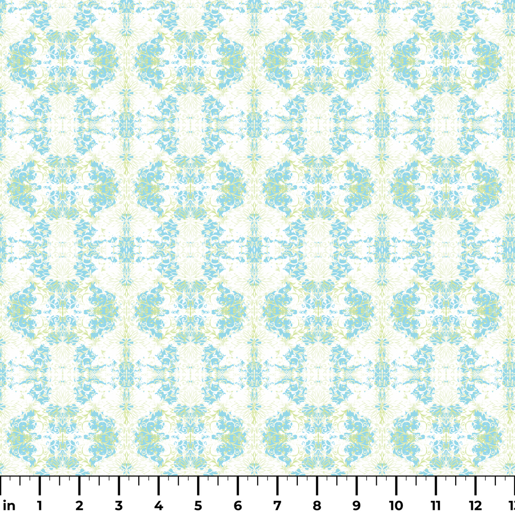 This ethereal pattern features a kaleidoscopic design of soft blue scrollwork intertwined with delicate pale green accents on a crisp white background. The symmetrical arrangement creates a dreamy, almost underwater feel with its swirling motifs and floral-inspired elements dancing across the fabric. This refreshing fabric would transform beautifully into lightweight summer curtains or create stunning accent pillows that bring a breath of spring into any space.