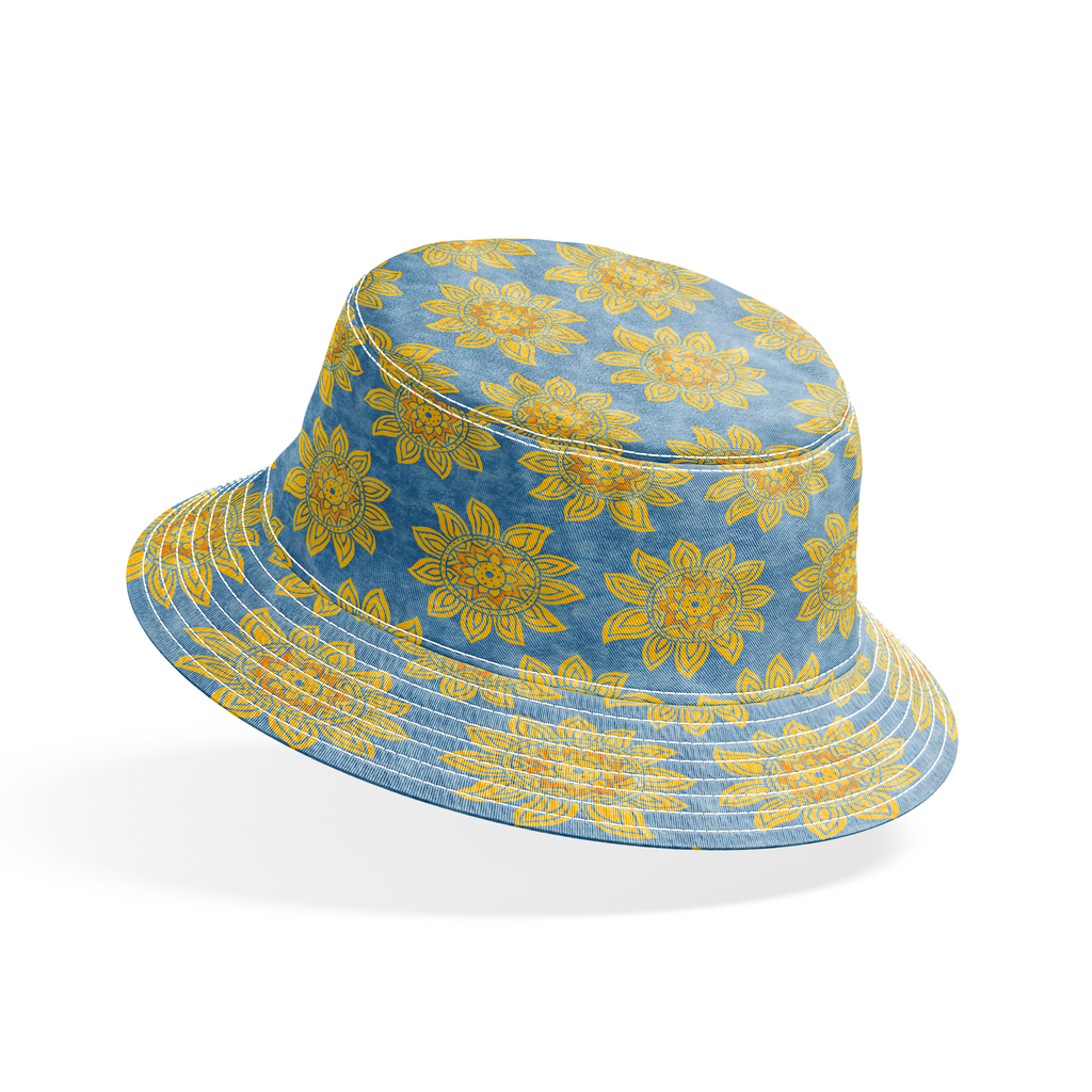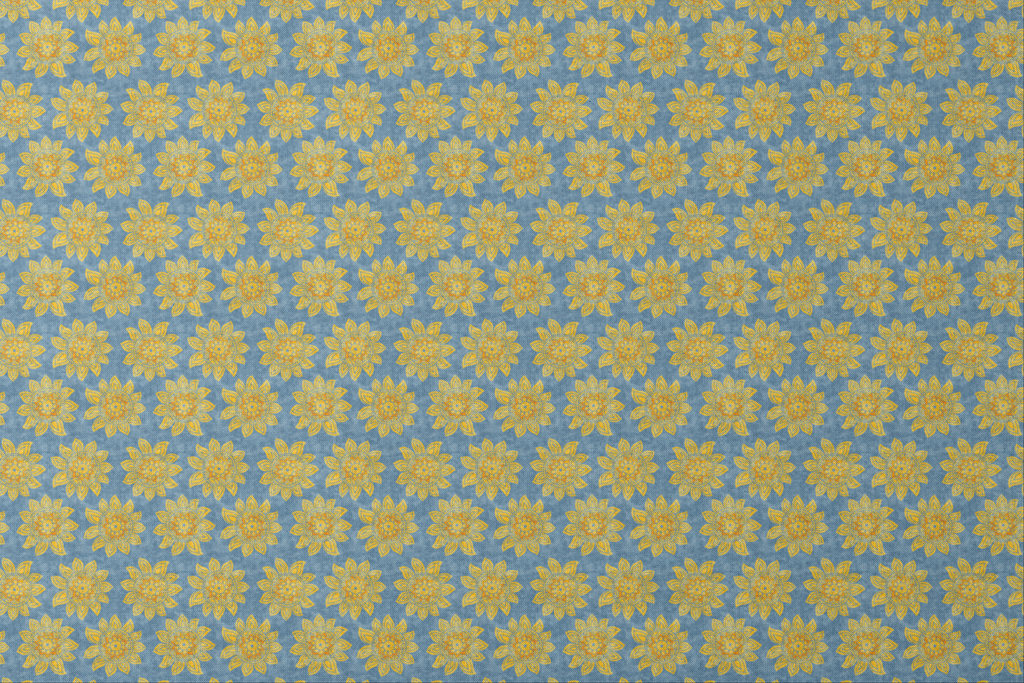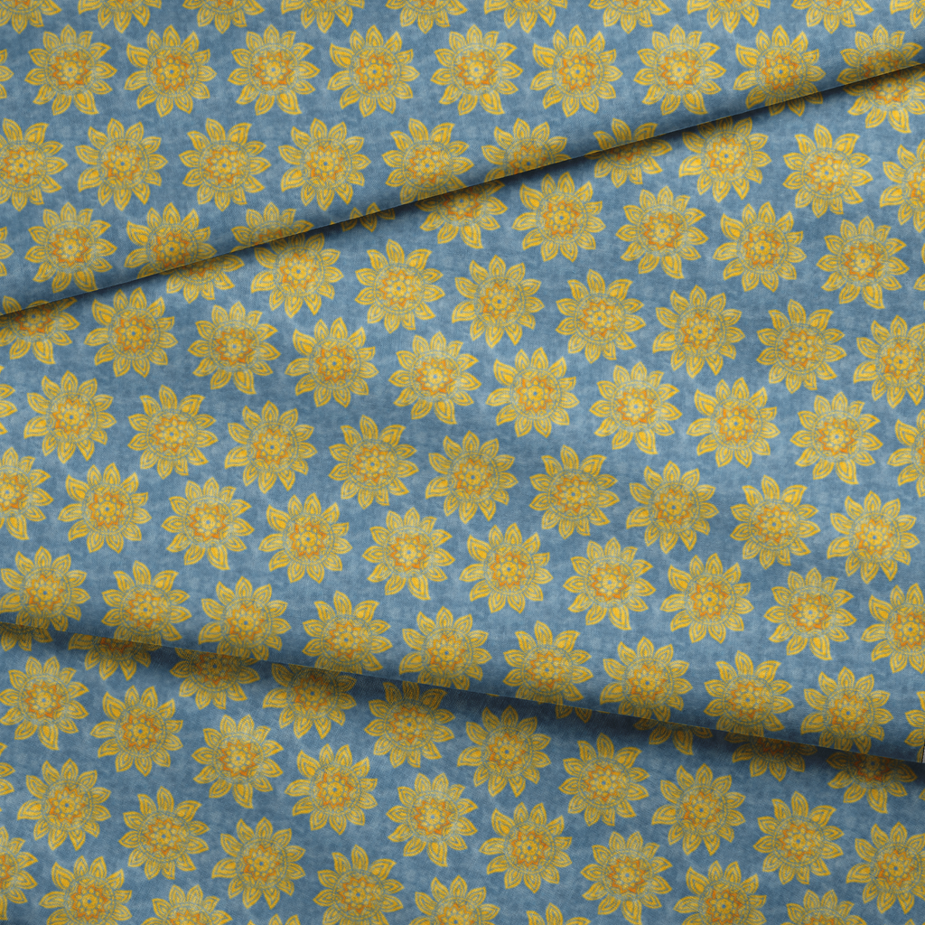Vibrant golden sunflowers bloom across a textured slate blue background, creating a striking contrast that catches the eye instantly. The mandala-like centers of each flower feature intricate geometric patterns that give this fabric an artistic, bohemian flair. Perfect for summer tote bags or accent pillows that bring warmth to any space.