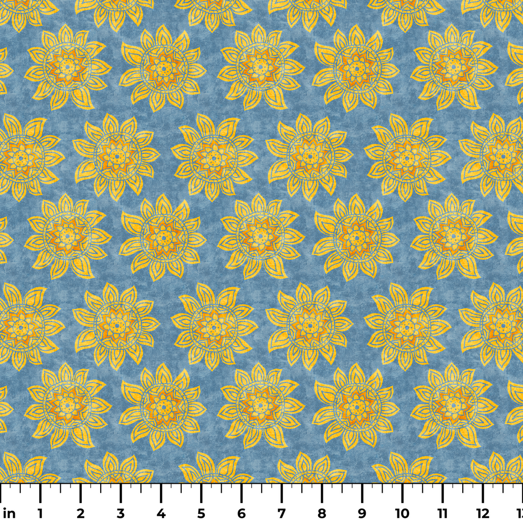 Tim Coffey - Sunny Mandalas - Golden Sunflower Blue Fabric