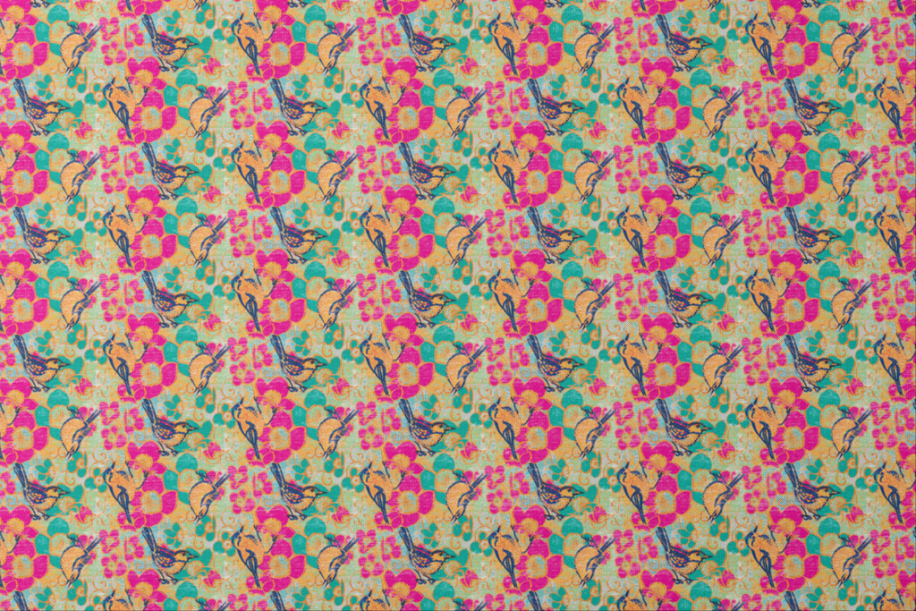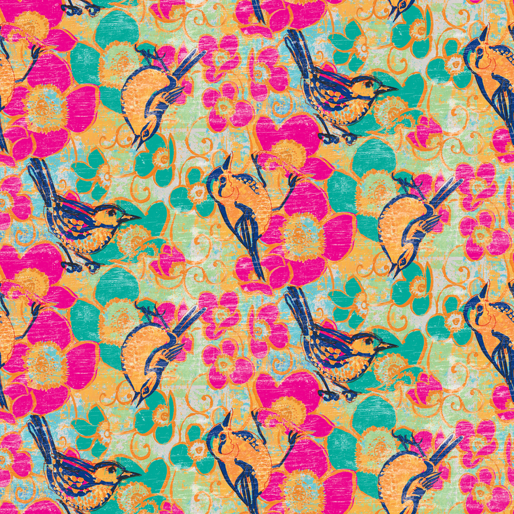 This vibrant folk-inspired print features deep magenta blooms and navy blue birds dancing against a backdrop of turquoise flowers and golden swirls. The artwork has a gorgeous hand-printed quality with a textured appearance that adds depth to the brilliant colors. Perfect for eye-catching cushion covers or a statement tote bag that captures bohemian charm with its whimsical birds and bold floral motifs.