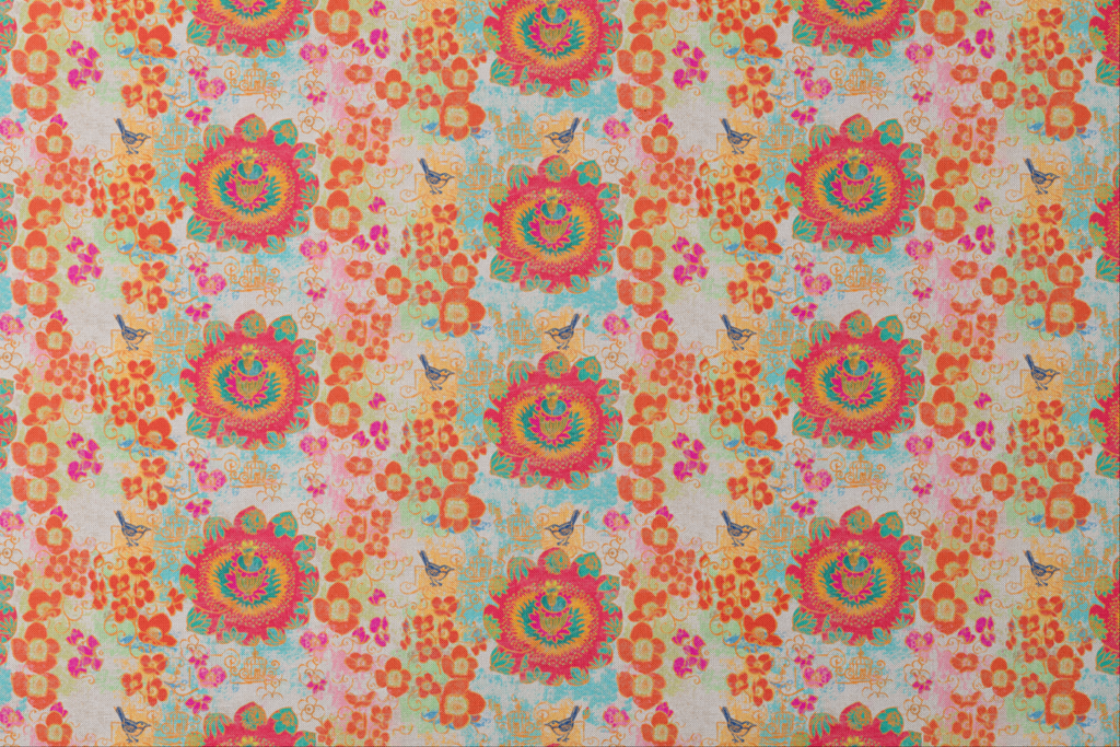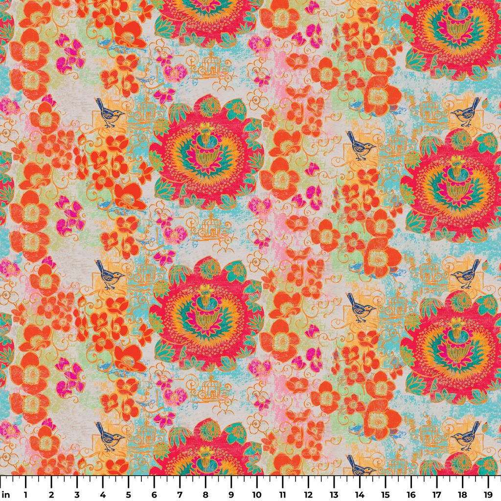 This enchanting fabric bursts with vibrant coral flowers and intricate medallions against a softly textured background of aqua, mint, and cream. Delicate blue songbirds perch among golden birdcages and swirling tendrils, creating a whimsical garden scene with a vintage-inspired aesthetic. The rich color palette blends warm magenta, orange, and turquoise in a harmonious dance across the surface. Perfect for statement cushions that brighten a neutral sofa or as a stunning accent fabric for quilting projects that deserve a touch of artistic flair.