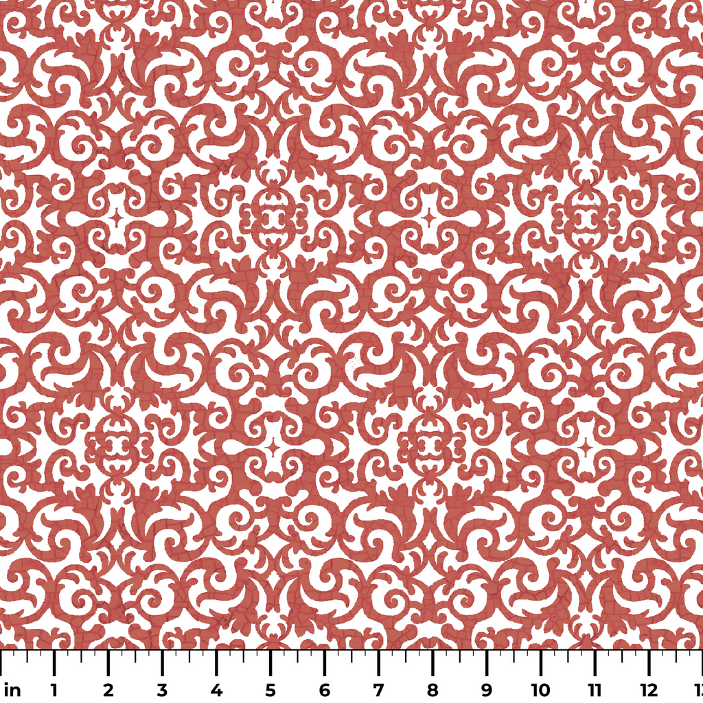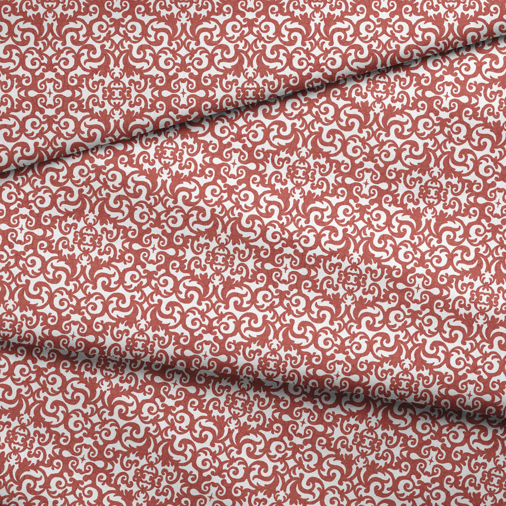 Elegant terracotta scrollwork dances across a crisp white background in this sophisticated damask-inspired pattern. The intricate swirls and flourishes create a mesmerizing rhythm that brings Old World charm to any space. This fabric would make stunning throw pillows for your living room or an eye-catching table runner for special gatherings.
