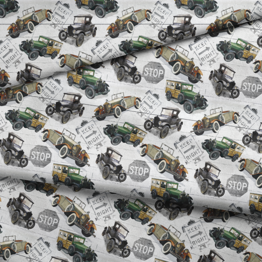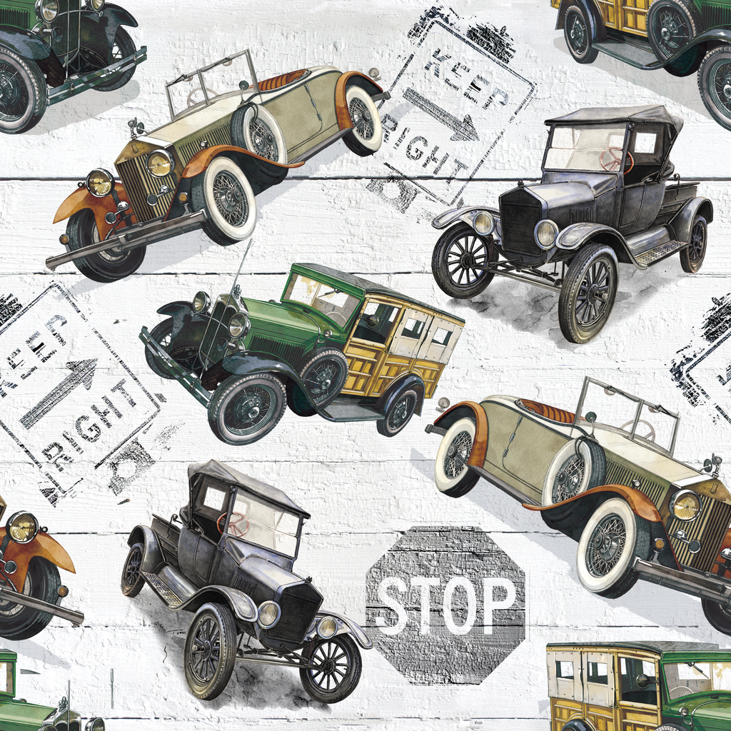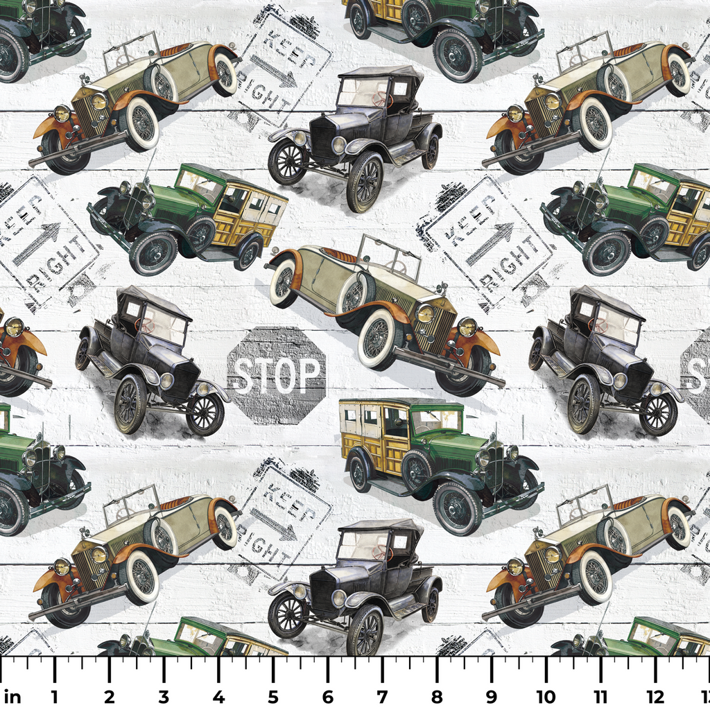 Vintage automobiles cruise across a weathered white backdrop in this nostalgic fabric design featuring meticulously detailed classic cars from the early 20th century. Rich earth tones of forest green, warm tan, and deep black create a sophisticated palette, enhanced by thoughtful details like faded stop signs and postmark stamps that add authentic character. Perfect for quilting projects for the car enthusiast in your life or creating unique throw pillows for a den or man cave with retro flair.
