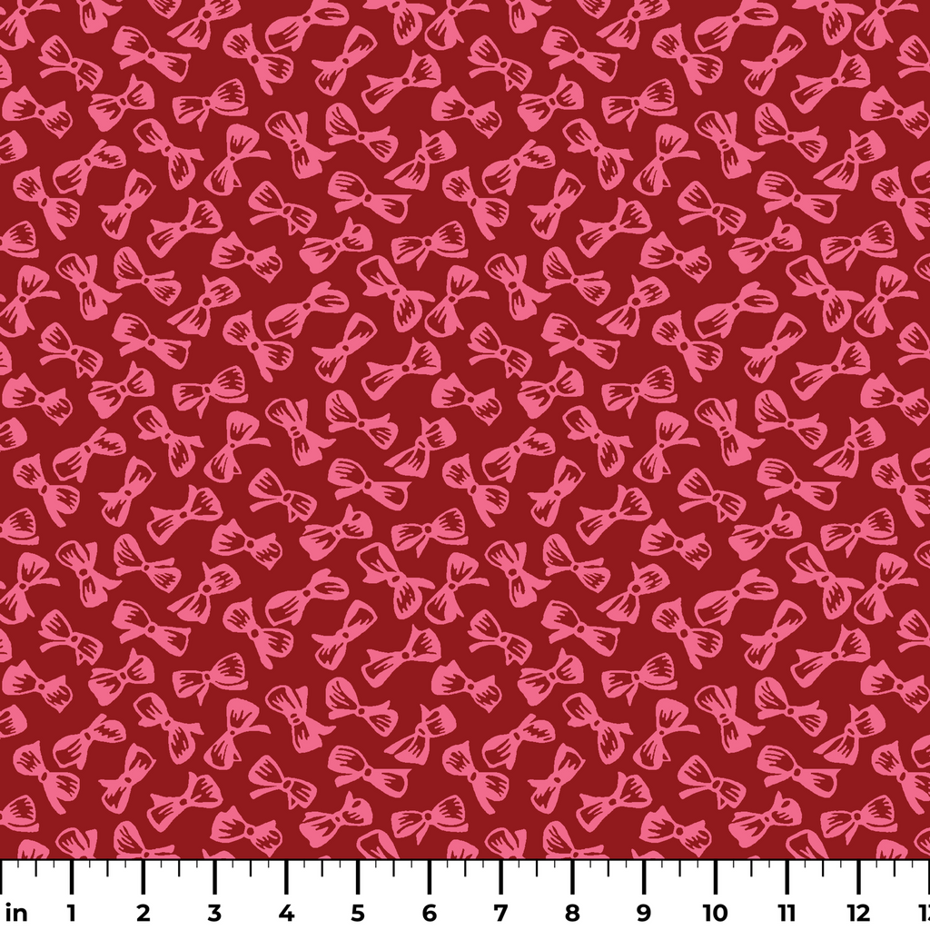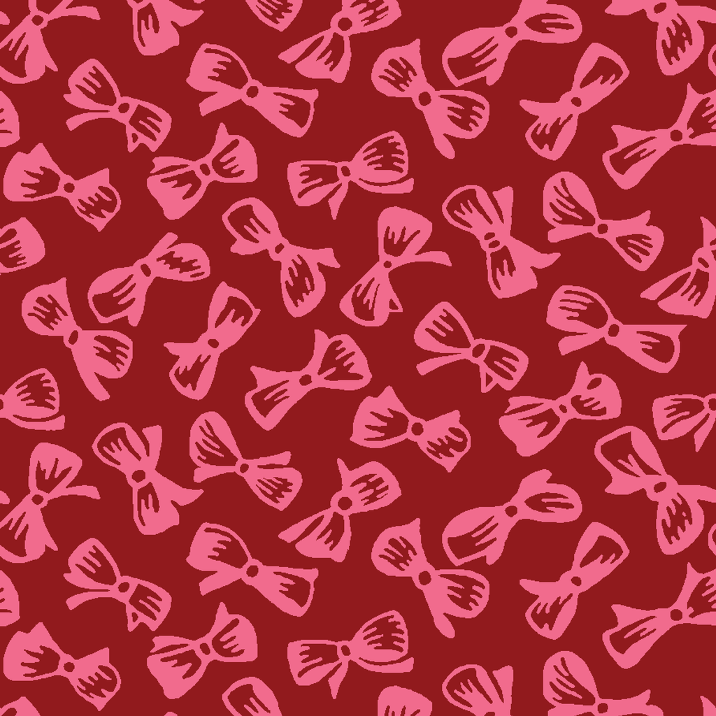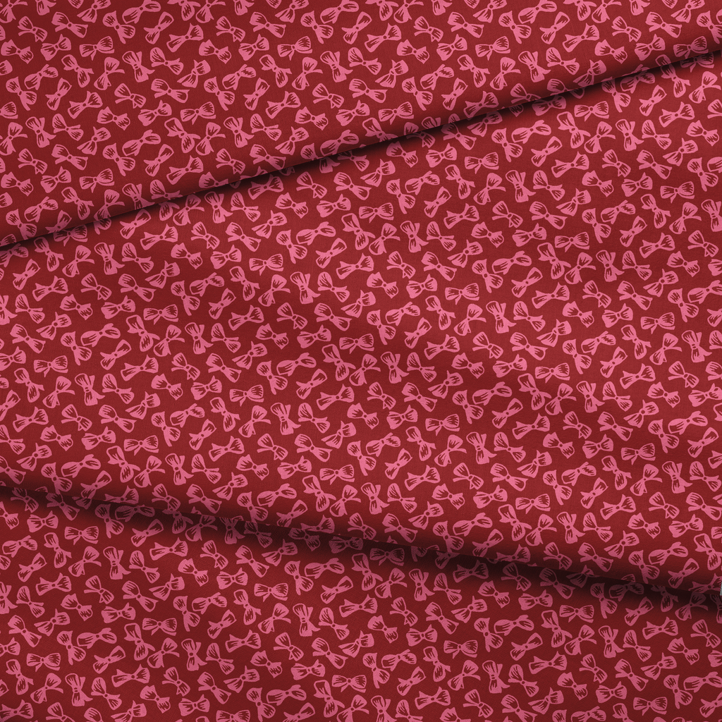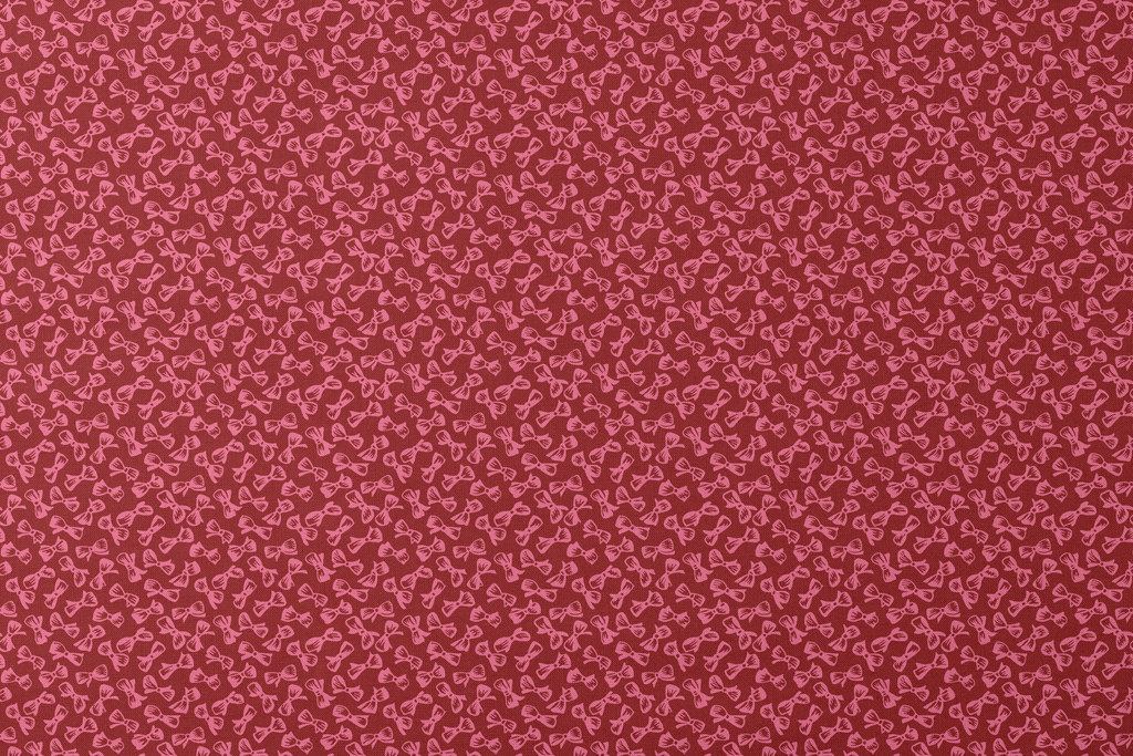 Pink bow pattern on a crimson background with a playful scattered layout, perfect for feminine apparel and accessories.