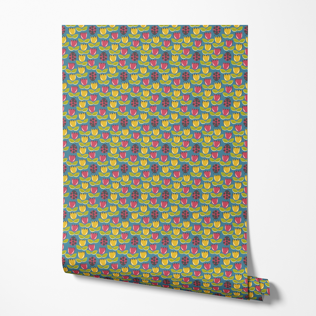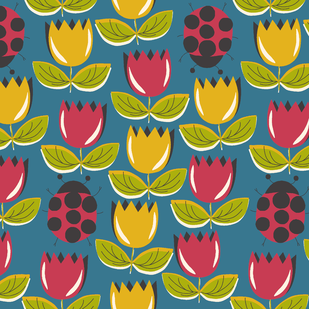 Cheerful retro tulip pattern with whimsical ladybugs on a teal background, featuring stylized flowers in bold red and yellow with green leaves for a playful mid-century modern look.