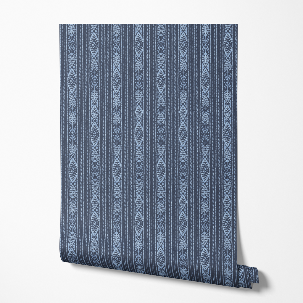 Indigo blue tribal pattern featuring geometric diamond motifs with intricate dotted lines creates a striking ethnic textile design perfect for bohemian home decor.