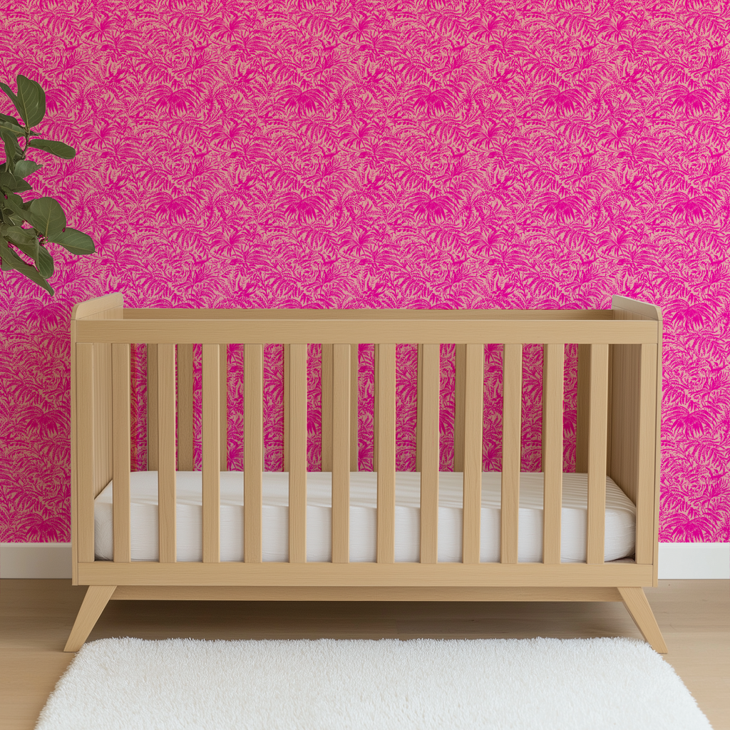 Vibrant hot pink tropical botanical featuring ferns, monstera and palm fronds in a maximalist jungle abstract.