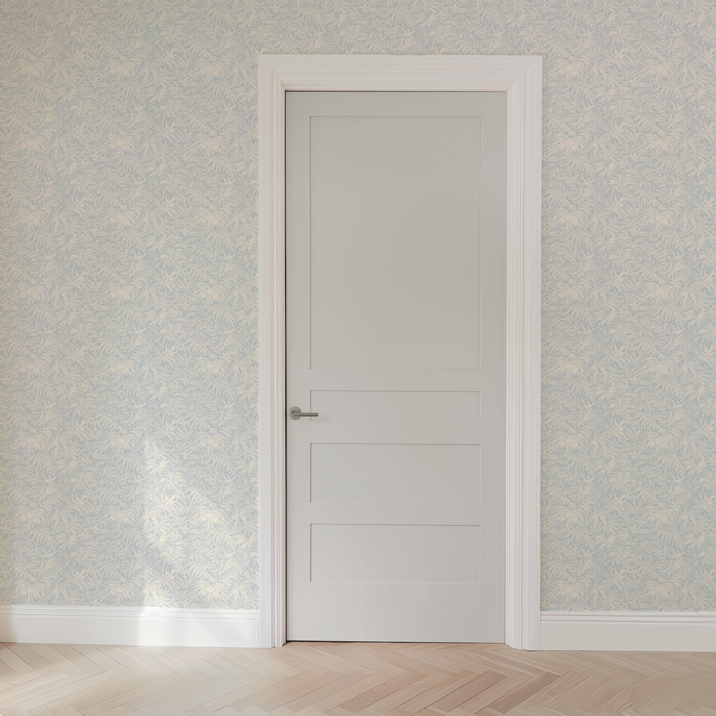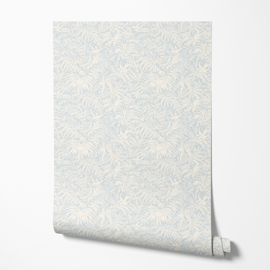 Soft blue and cream tropical leaf pattern creates a serene, sophisticated botanical wallpaper design with delicate palm fronds and fern details for a vintage-inspired coastal look.