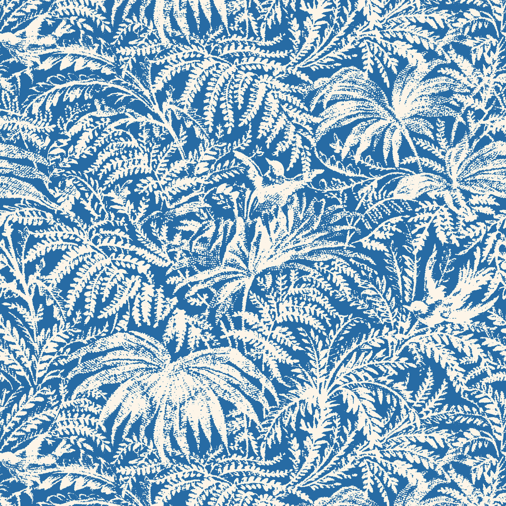 Beautiful blue and white tropical leaf pattern featuring elegant ferns and palm fronds in a classic botanical print style.
