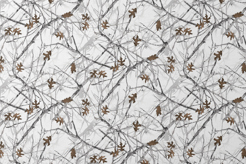 True Timber camo featuring brown oak leaves scattered among white bare branches on a white snowy background. Perfect for hunting gear or outdoor camouflage apparel.
