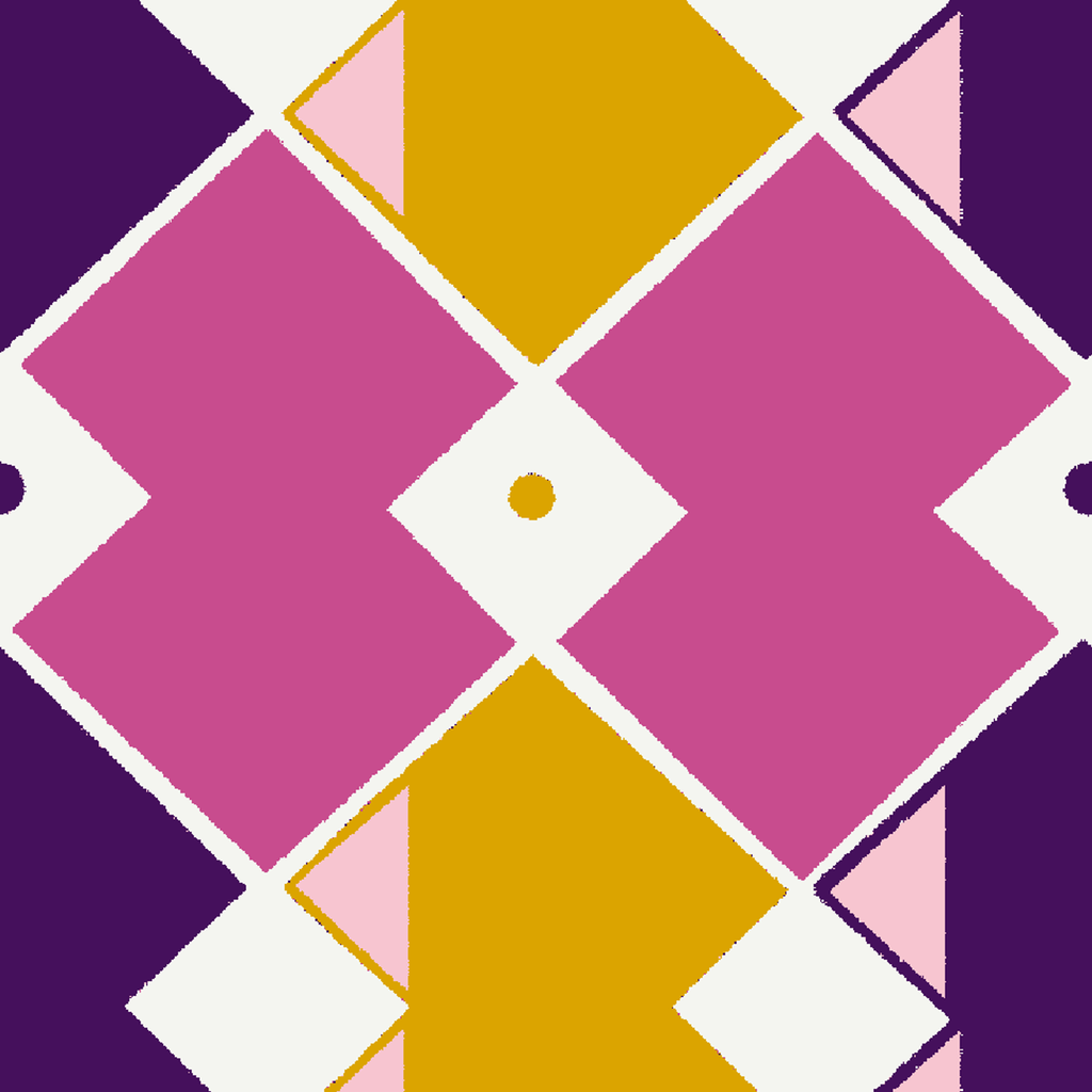 Bold geometric pattern featuring pink diamonds, golden yellow accents, and purple corners in a retro mid-century modern style with a symmetrical Art Deco inspired design.