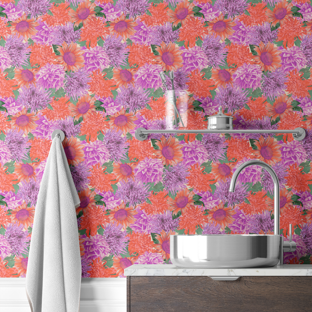 Vibrant Dahlia Garden on Orange & Purple Wallpaper