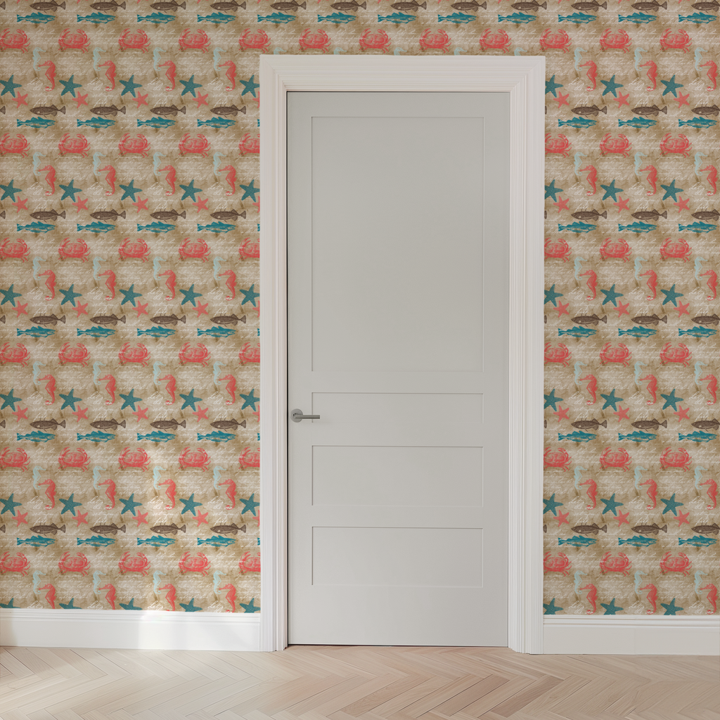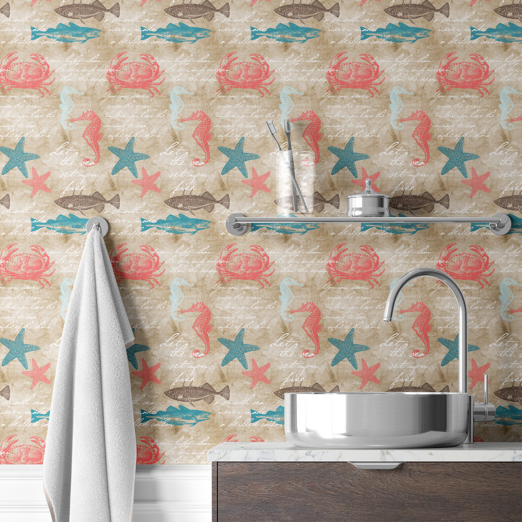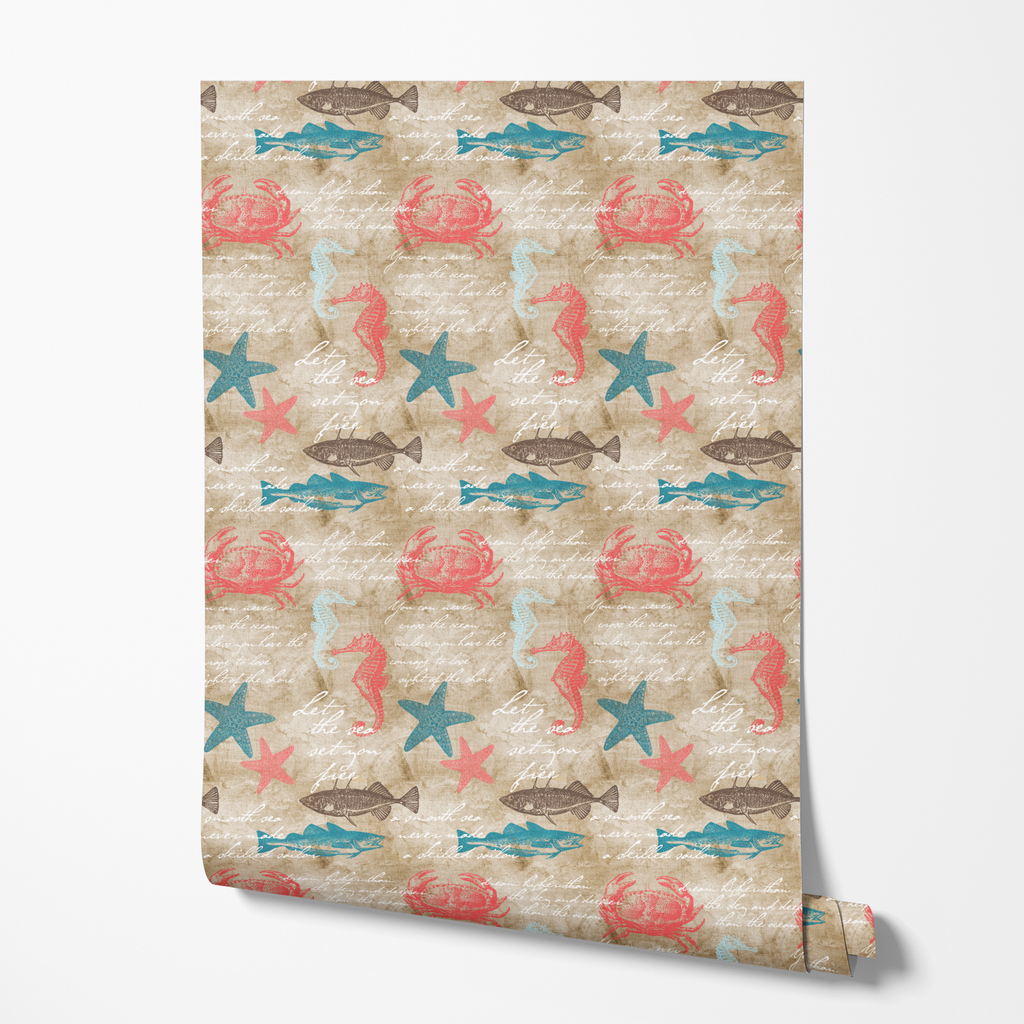 This vintage coastal pattern features ocean life with pink crabs, turquoise fish, and coral seahorses against a textured beige background with handwritten script details.