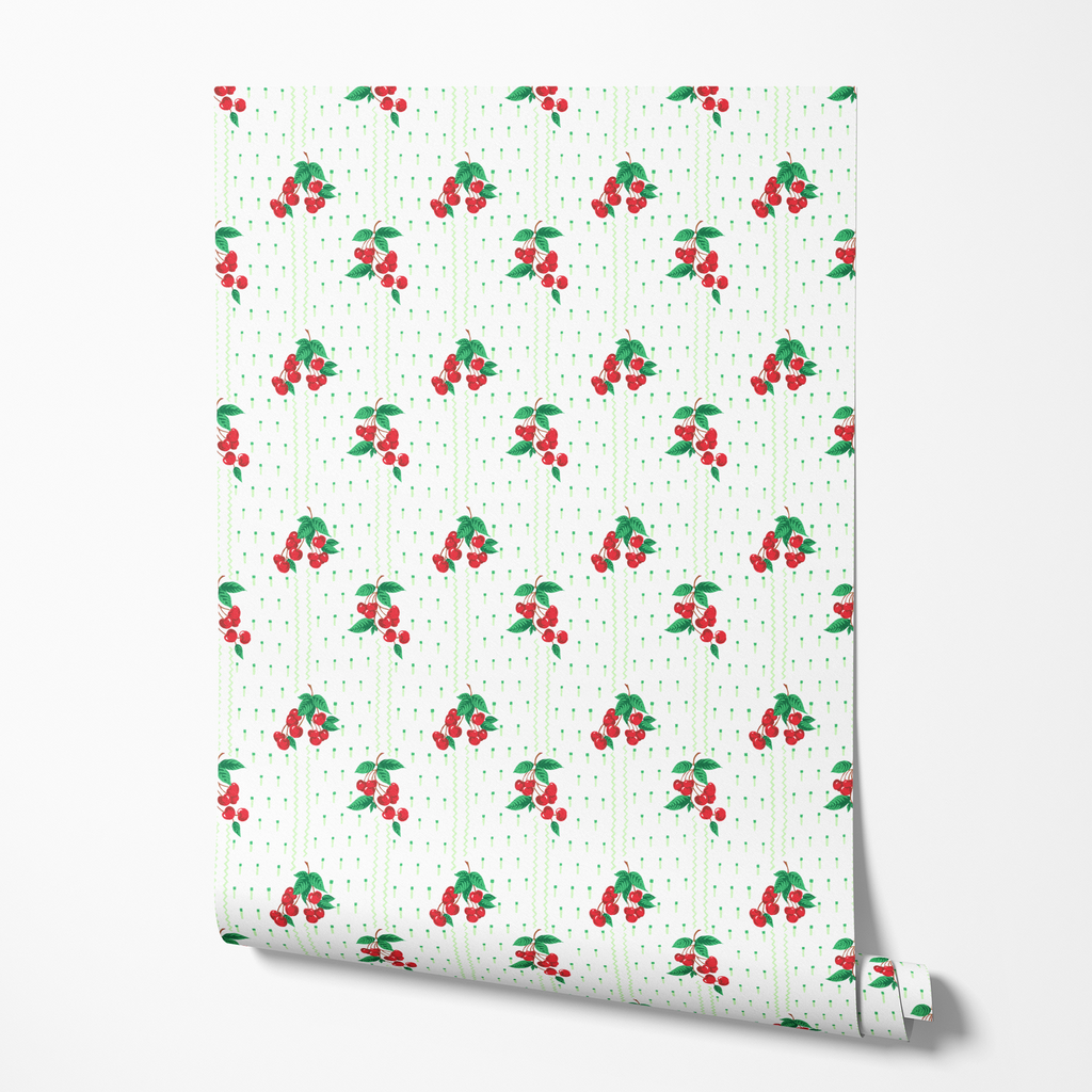 Vintage cherry pattern featuring bright red cherries with green leaves scattered on a white background with delicate green grid lines, perfect for retro kitchen decor.