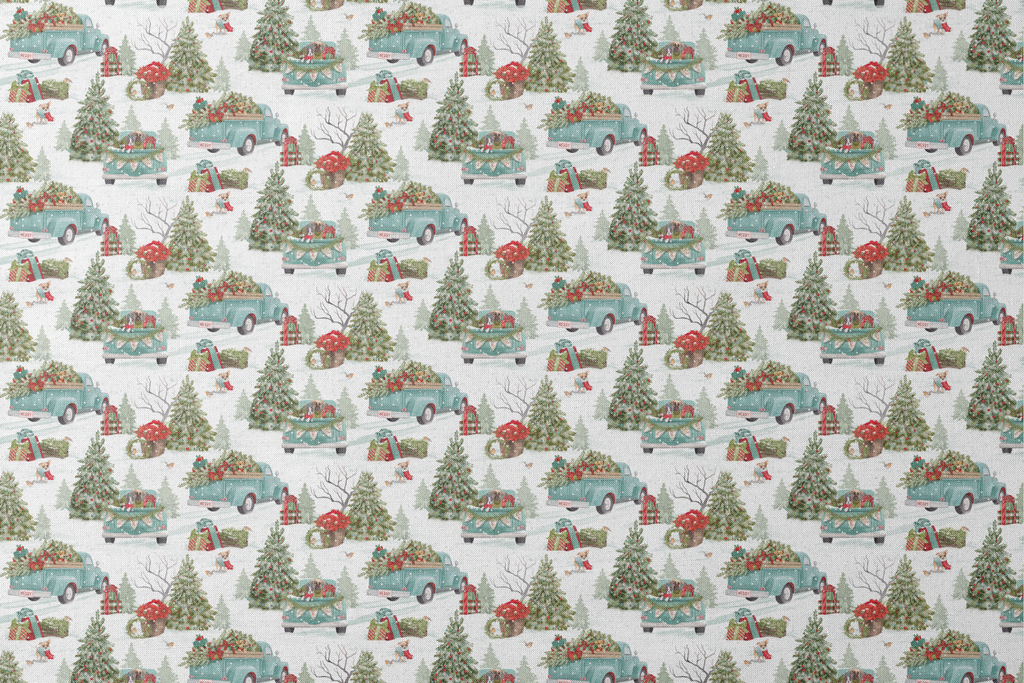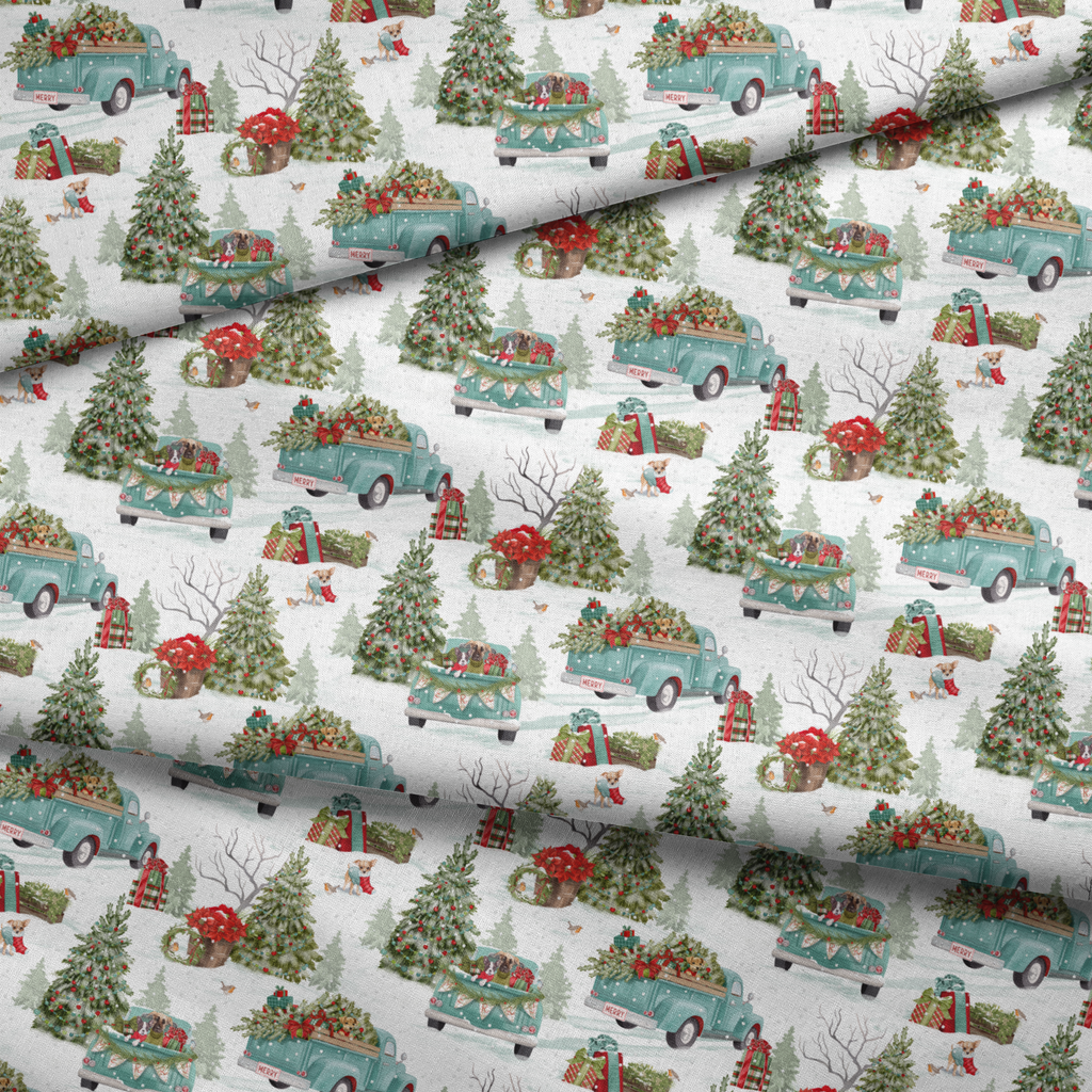 Celebrate the season with this nostalgic holiday fabric design by Nicole Tamarin, featuring vintage trucks, festive trees, and charming winter scenes. Perfect for handmade holiday decor, Christmas quilts and festive wall hangings.
