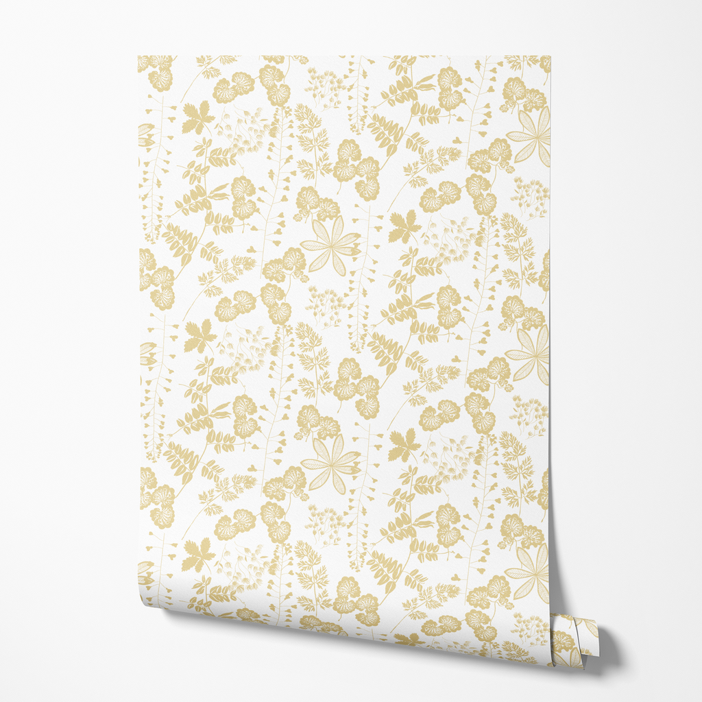 Rustic golden yellow botanical pattern featuring delicate wildflowers, dandelions and leaves on a crisp white background - perfect for a country cottage kitchens and transitional spaces.