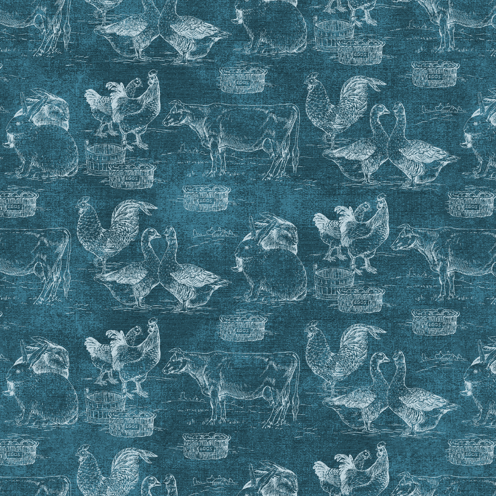 Vintage denim blue farmhouse pattern featuring roosters, chickens, cows and geese in a distressed, heritage style. Perfect for bringing rustic country vibes to any space.