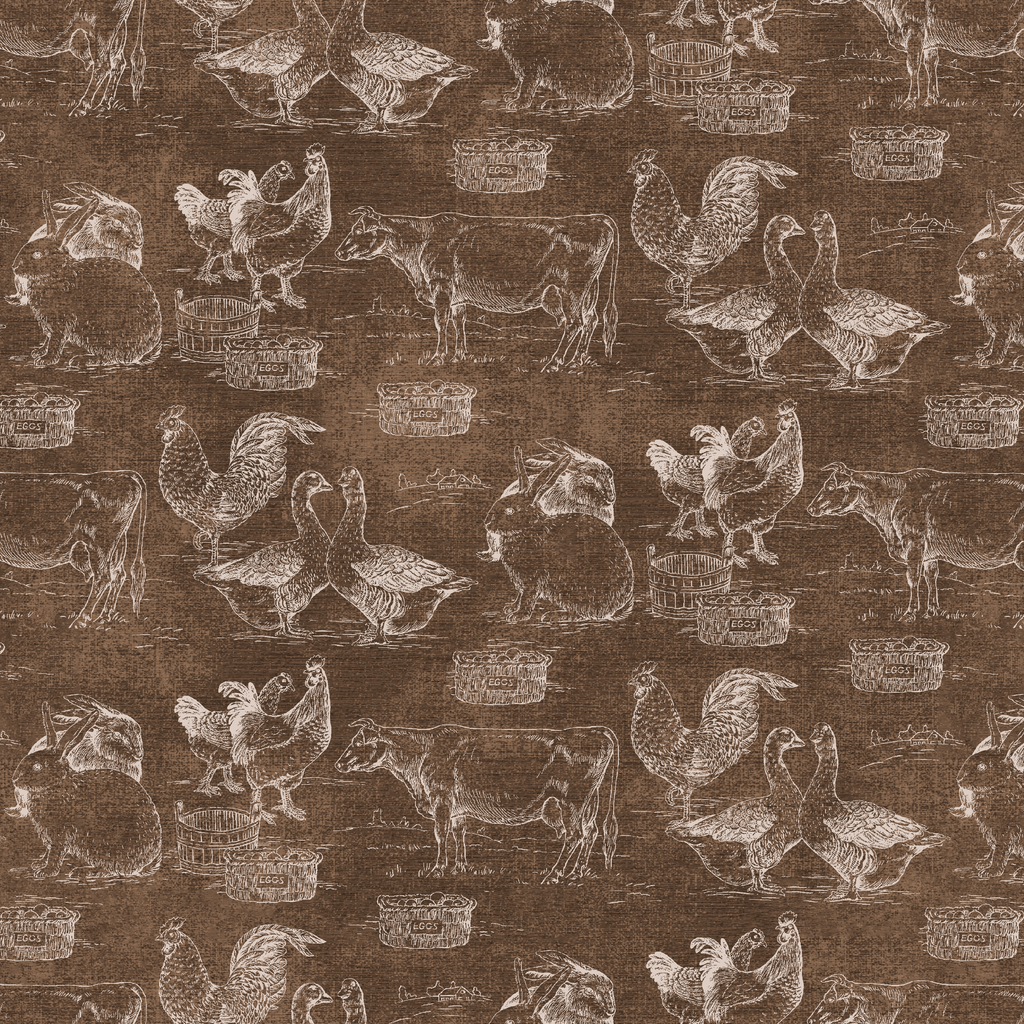 A rustic farmhouse design featuring sketched farm animals and poultry in a vintage weathered style. The brown and cream color palette creates a charming traditional look perfect for any space.