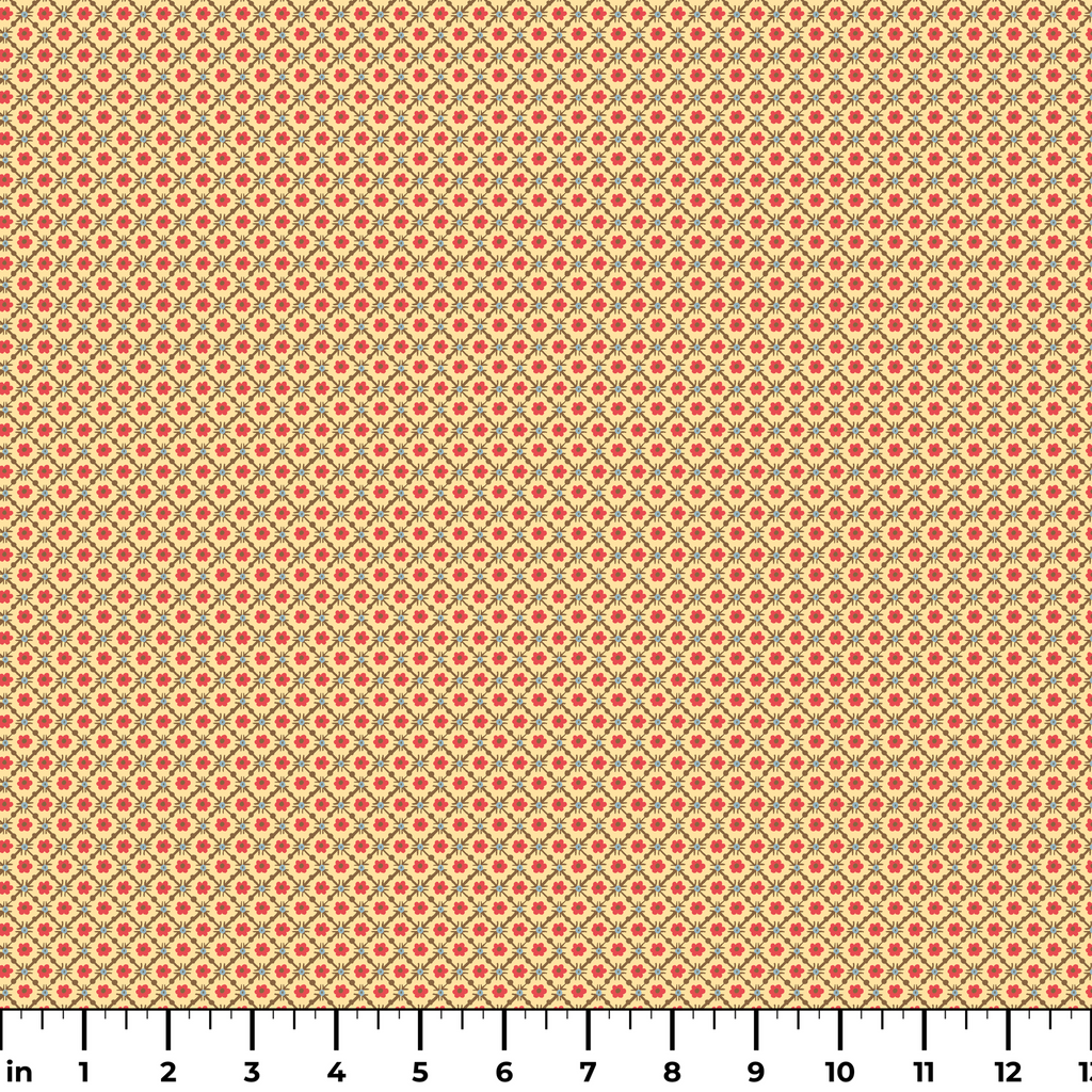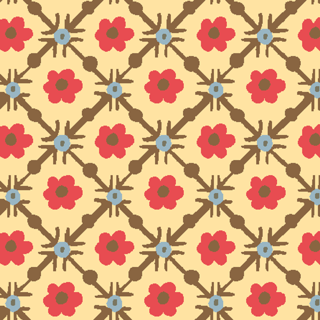 Vintage floral pattern with red blooms and blue accents on a cream background, featuring a geometric lattice design perfect for retro home decor.