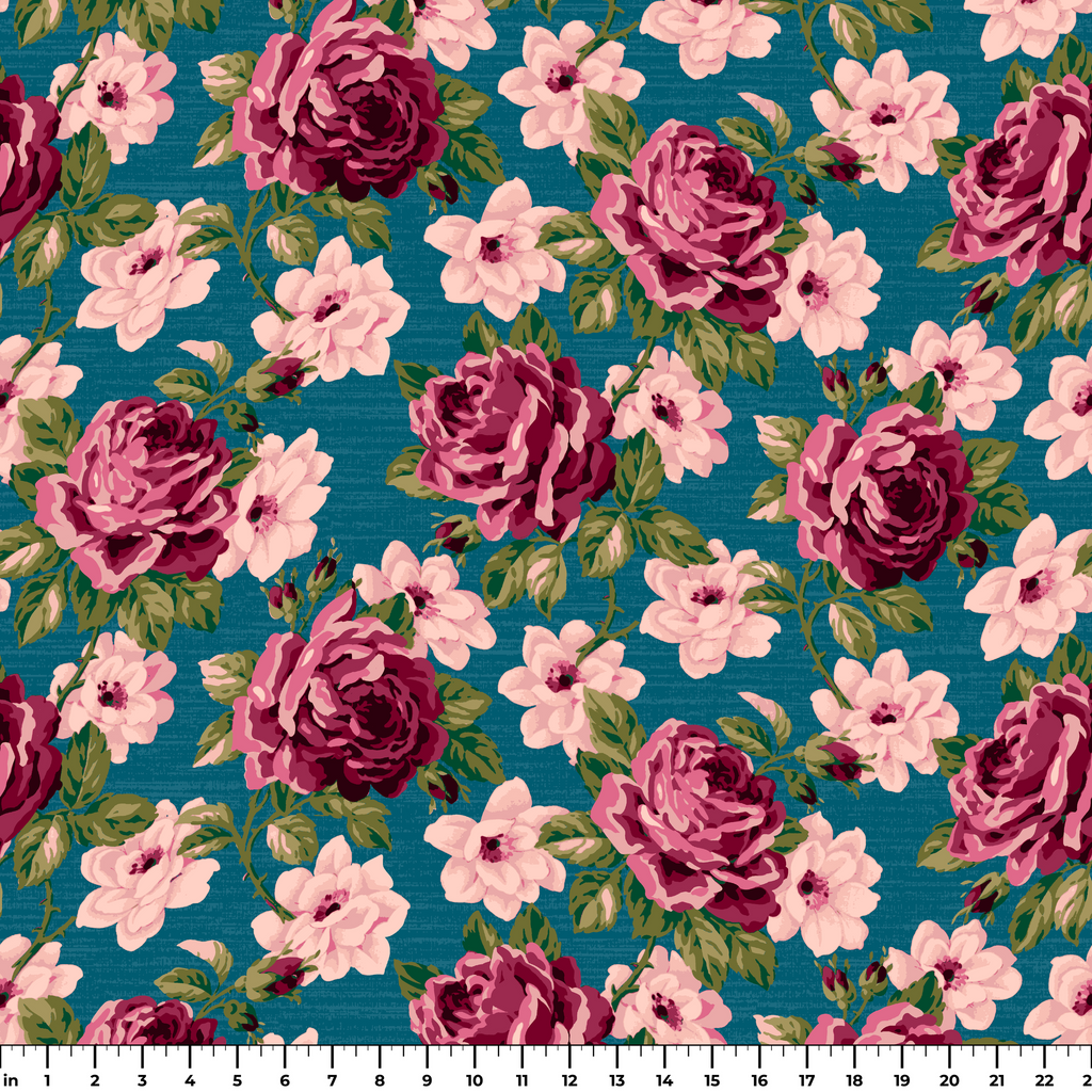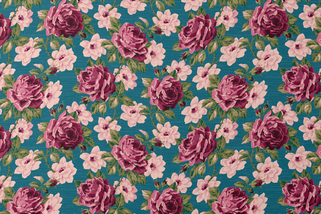 Beautiful vintage floral pattern featuring deep burgundy roses and light pink blossoms on a rich teal background, perfect for elegant home decor or fashion accessories.