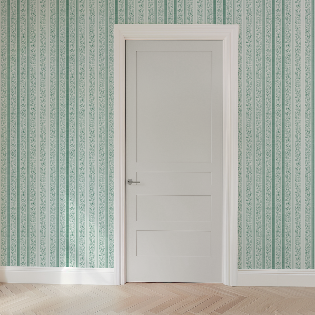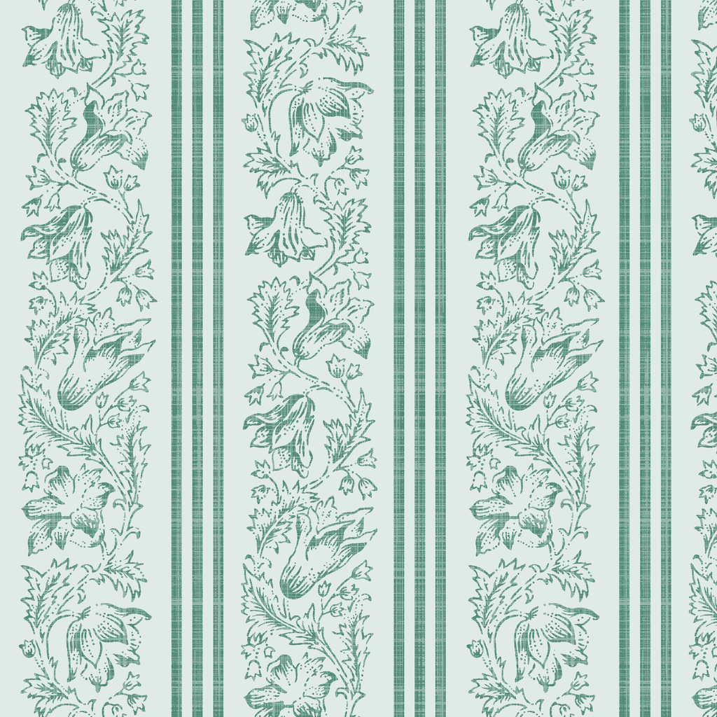 This elegant traditional pattern features delicate botanical illustrations with mint green floral motifs arranged in vertical stripes, creating a timeless and sophisticated vintage design perfect for any space.