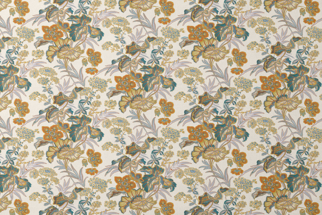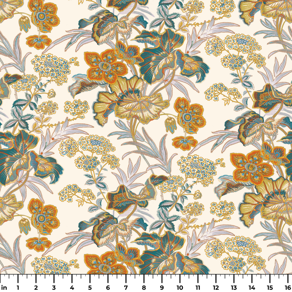 Elegant vintage floral pattern featuring ornate blooms in rich mustard yellow, teal, and sage green on a cream background, perfect for sophisticated home decor or fashion accessories.