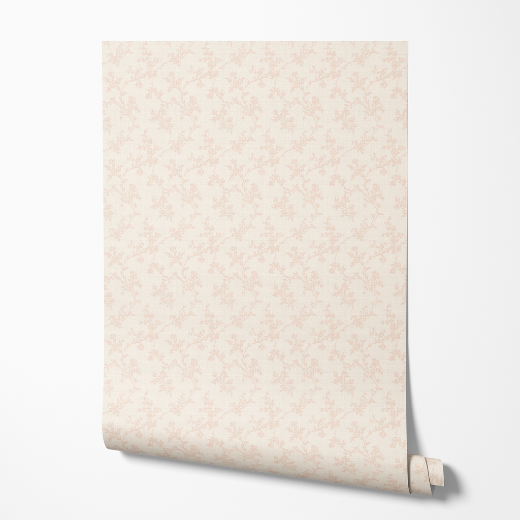 Vintage floral wallpaper with delicate rose pattern branches, perfect for creating a soft vintage look in bedrooms and living spaces.
