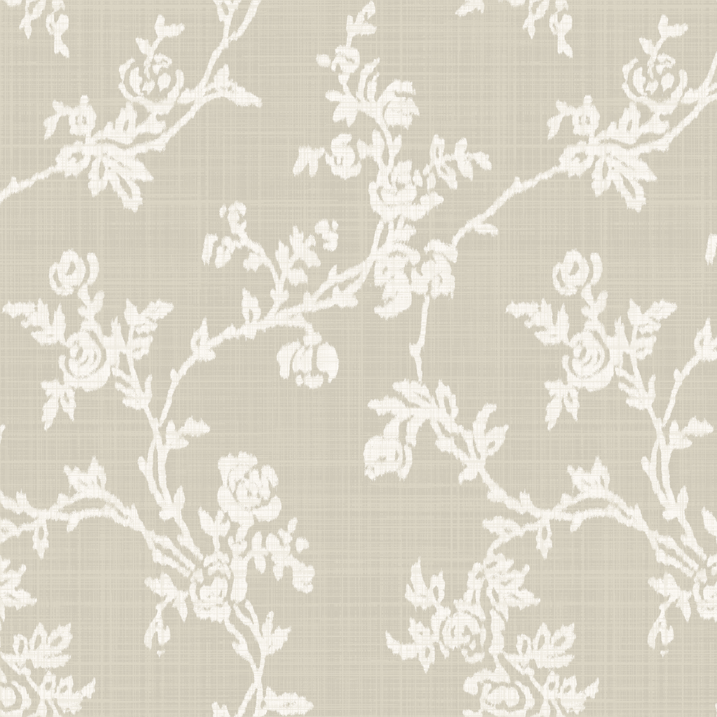 Vintage botanical toile design featuring delicate white blossoms on a soft taupe background, perfect for sophisticated interiors with a classic botanical aesthetic.