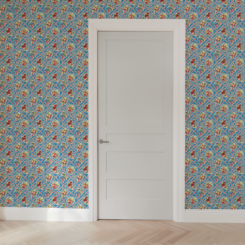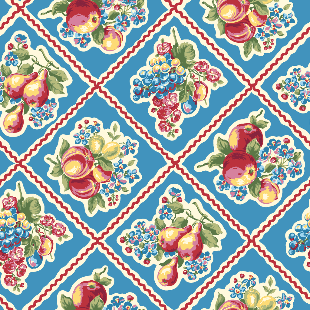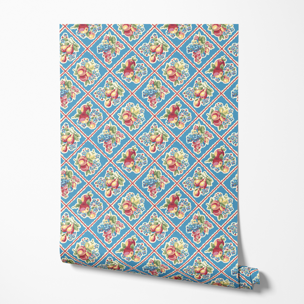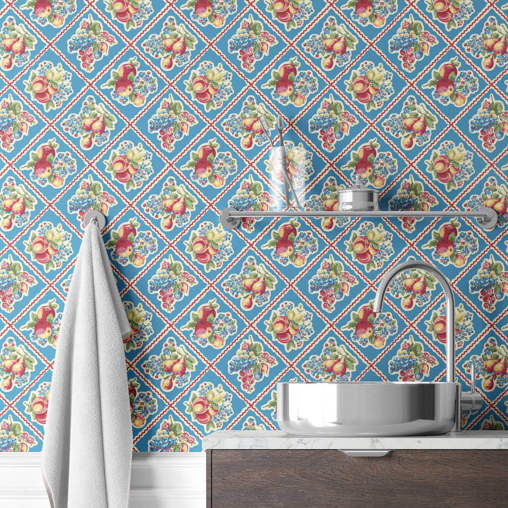 This colorful retro fruit pattern features colorful apples, pears and berries in a classic blue diagonal lattice design, perfect for nostalgic farmhouse kitchens and laundry rooms.