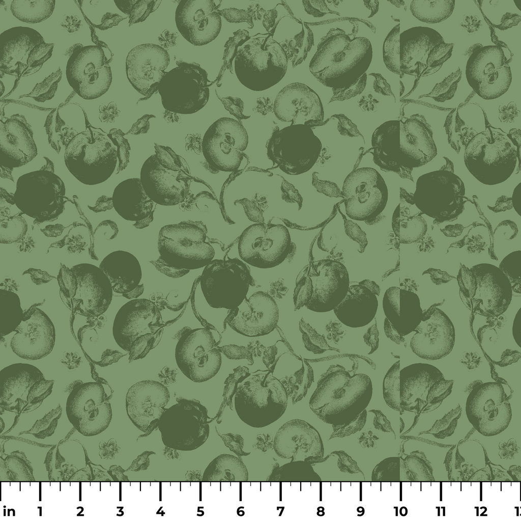 Classic botanical apple pattern in muted sage green tones creates a vintage kitchen-inspired design perfect for farmhouse decor, cooking enthusiasts, or rustic home accessories.