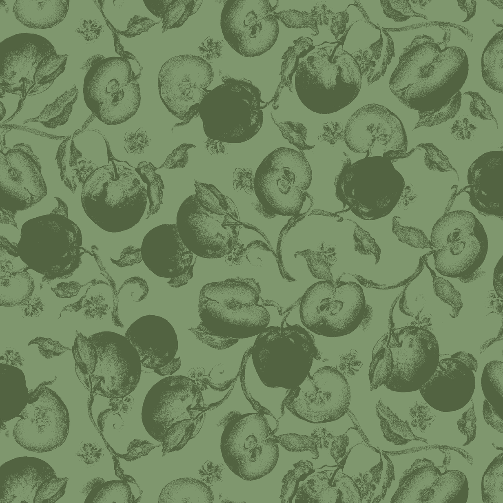 Classic botanical apple pattern in muted sage green tones creates a vintage kitchen-inspired design perfect for farmhouse decor, cooking enthusiasts, or rustic home accessories.