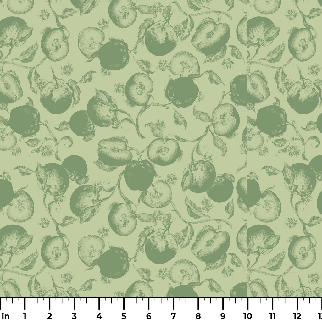This vintage botanical pattern features pomegranates in muted green tones, perfect for kitchen decor or rustic farmhouse style wallpaper.