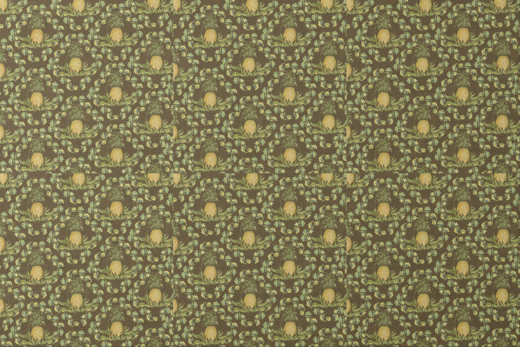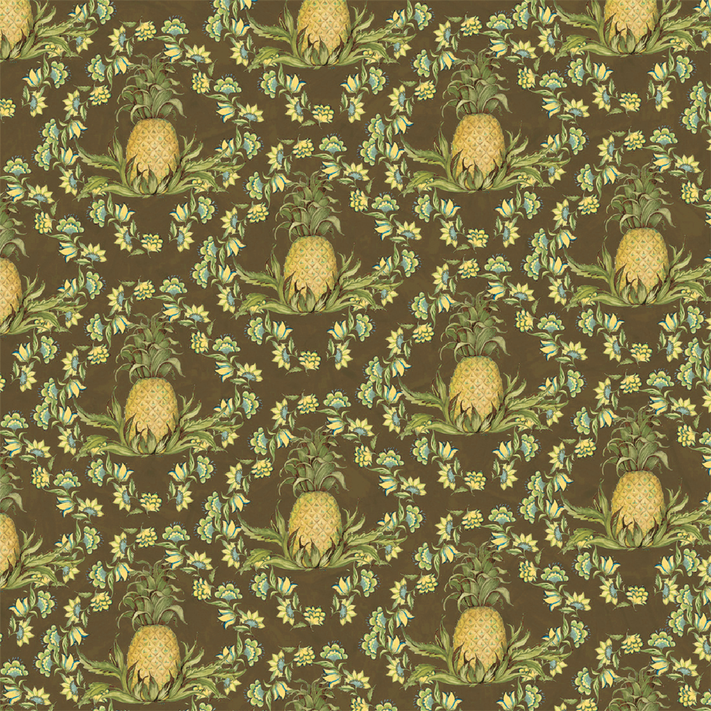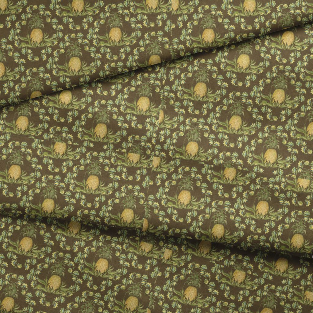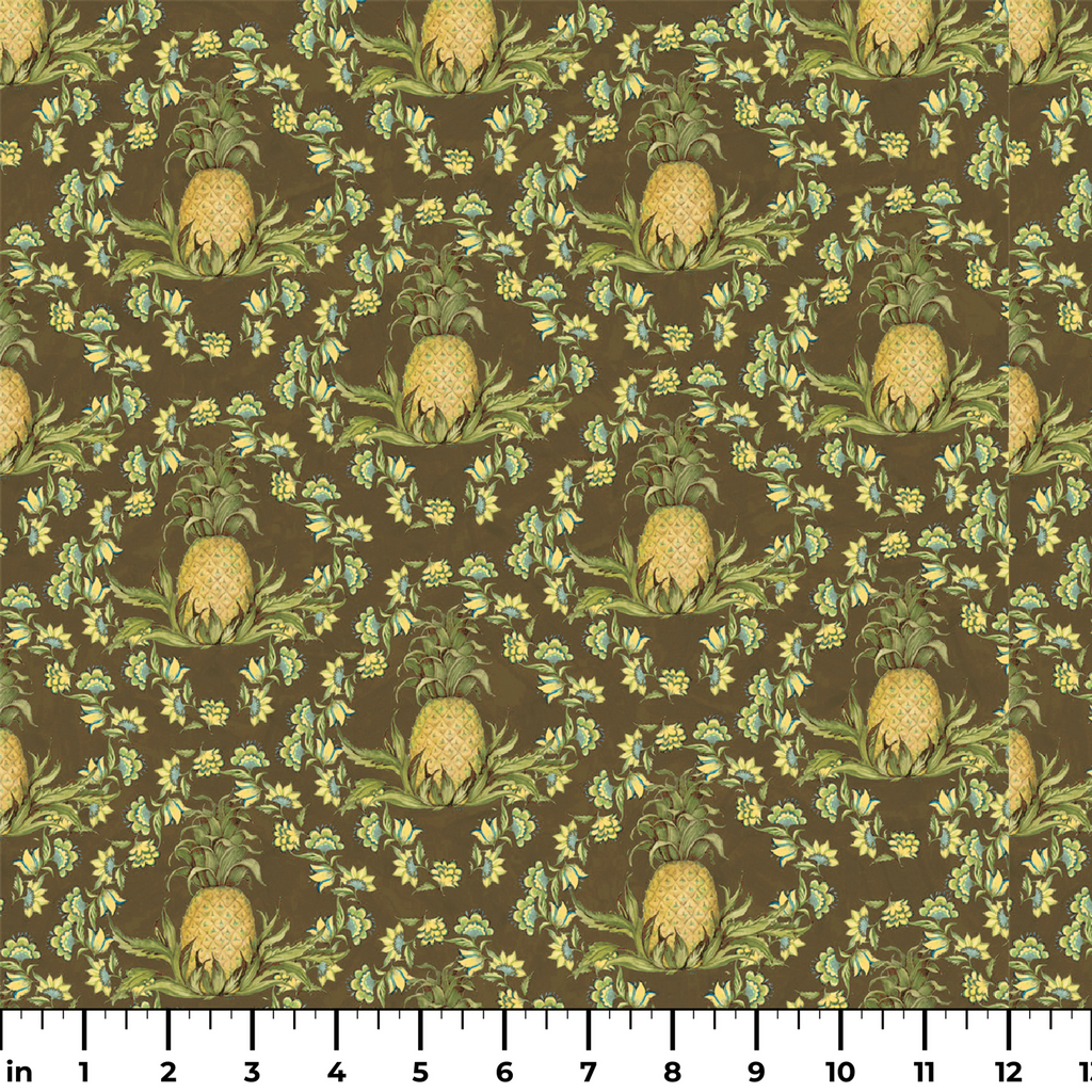 Vintage woodland pattern featuring golden pineapples surrounded by delicate white daisies on a rich olive background, perfect for heritage-inspired home decor with a tropical twist.