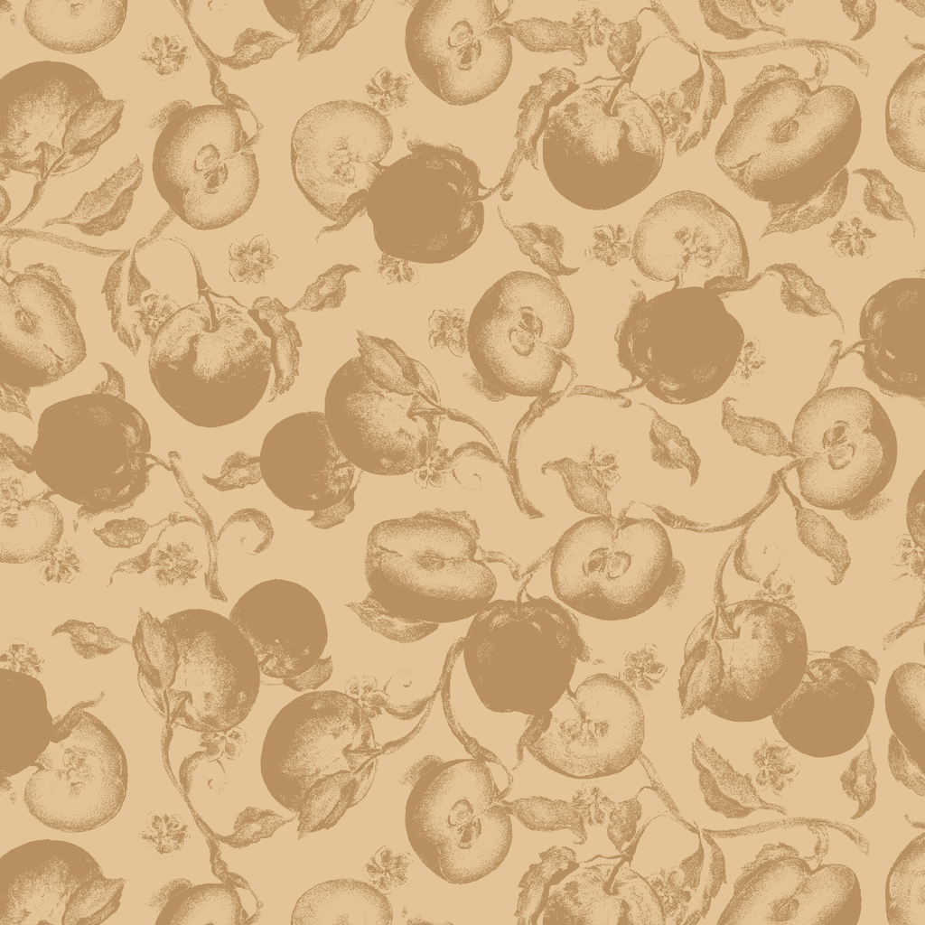 Vintage botanical pattern featuring pomegranate fruits and foliage in warm brown tones on a beige background, perfect for kitchen decor or rustic farmhouse style.