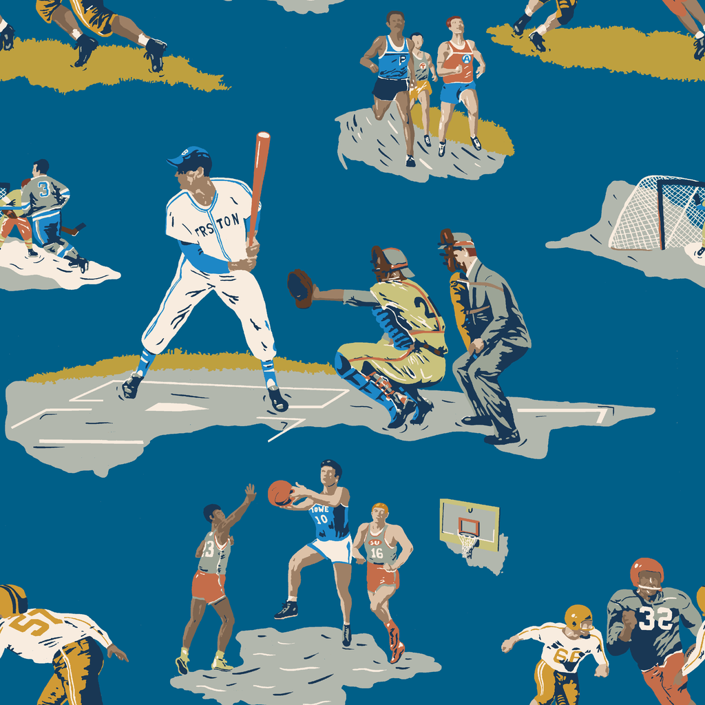 Vintage-style sports-themed wallpaper featuring retro sports illustrations of baseball, hockey, football, basketball, and track scenes on classic blue background.