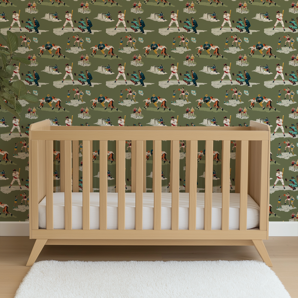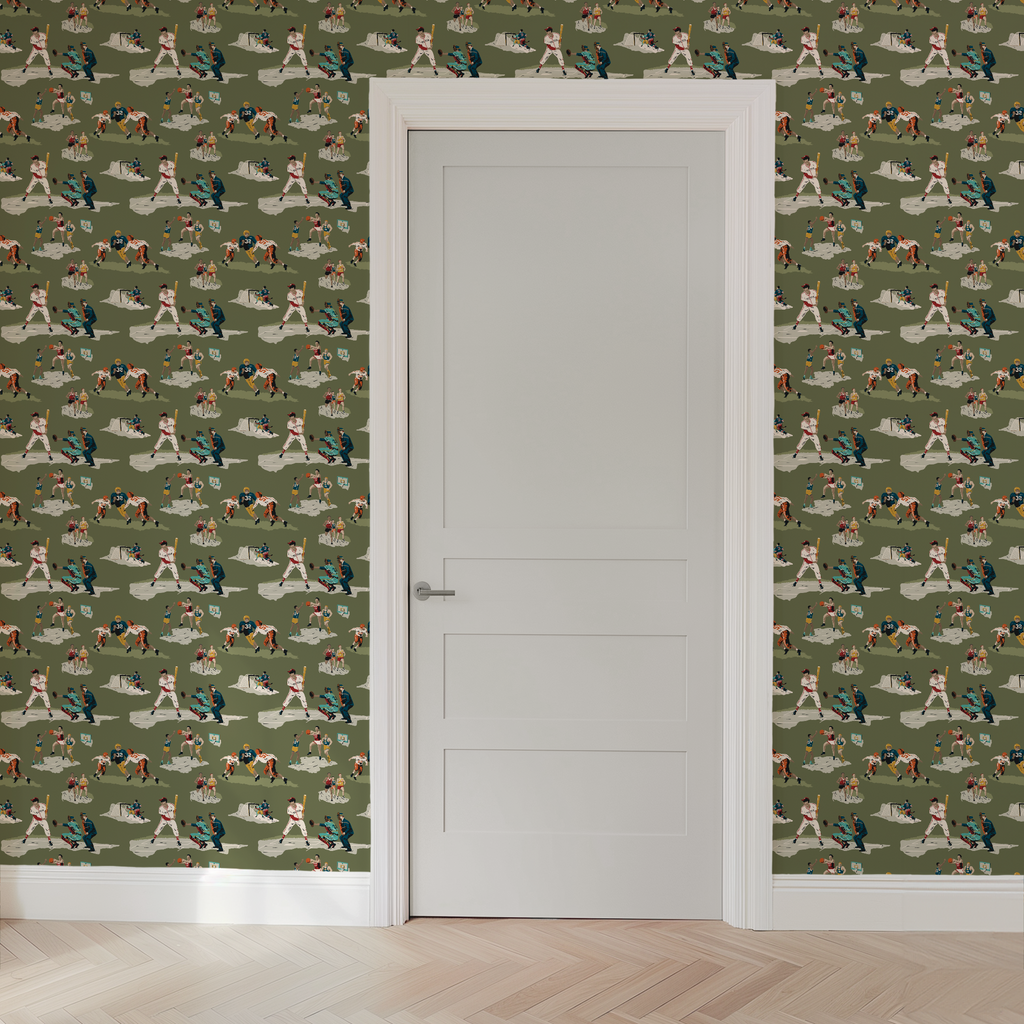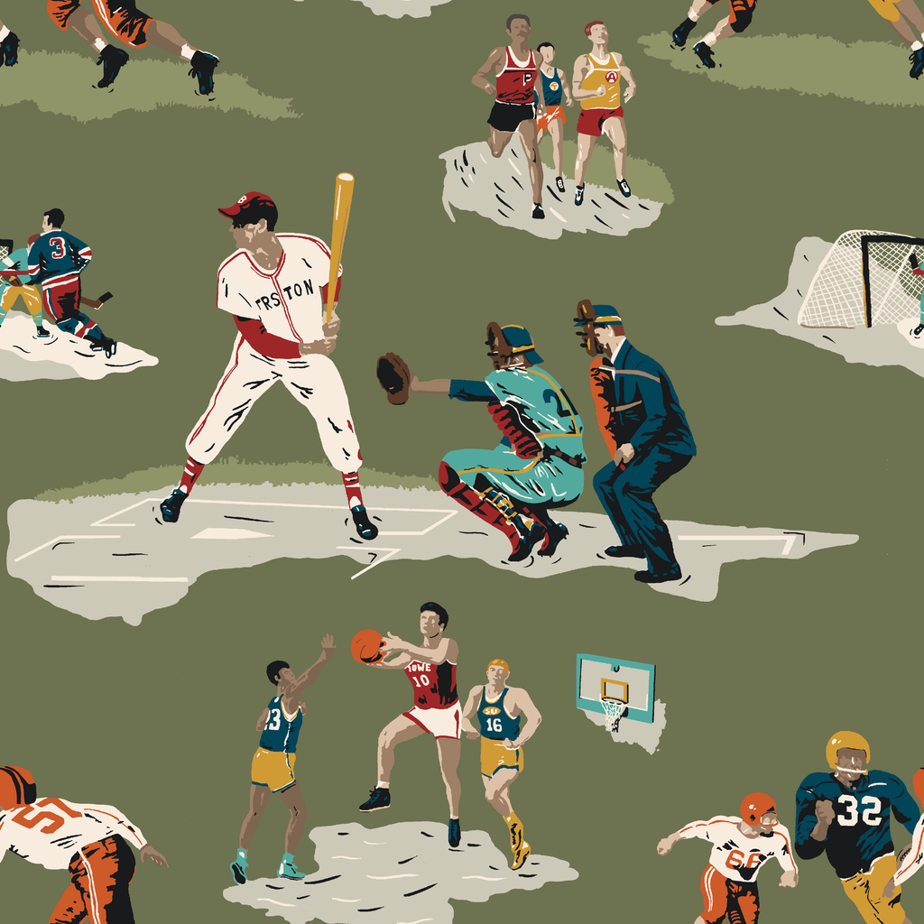 Vintage-style sports-themed wallpaper featuring retro sports illustrations of baseball, hockey, football, basketball, and track scenes on sage green background.