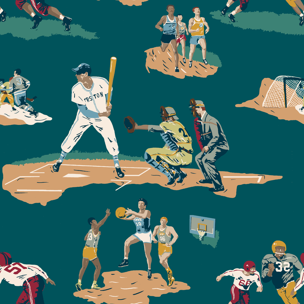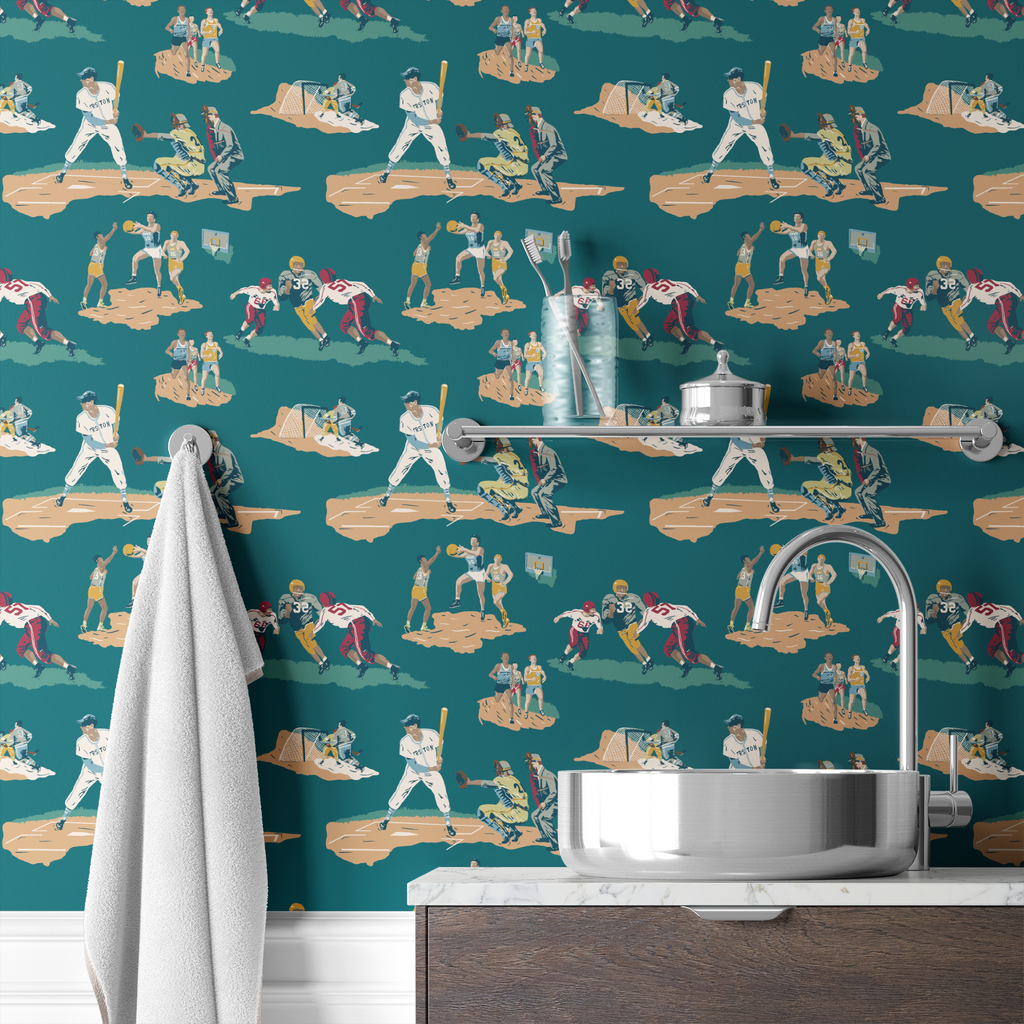 Vintage Sports Scenes on Teal Wallpaper