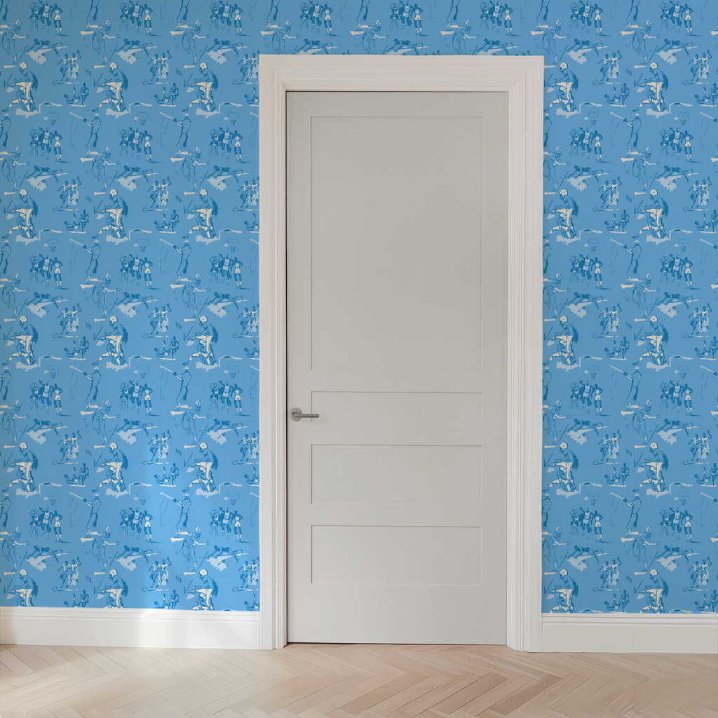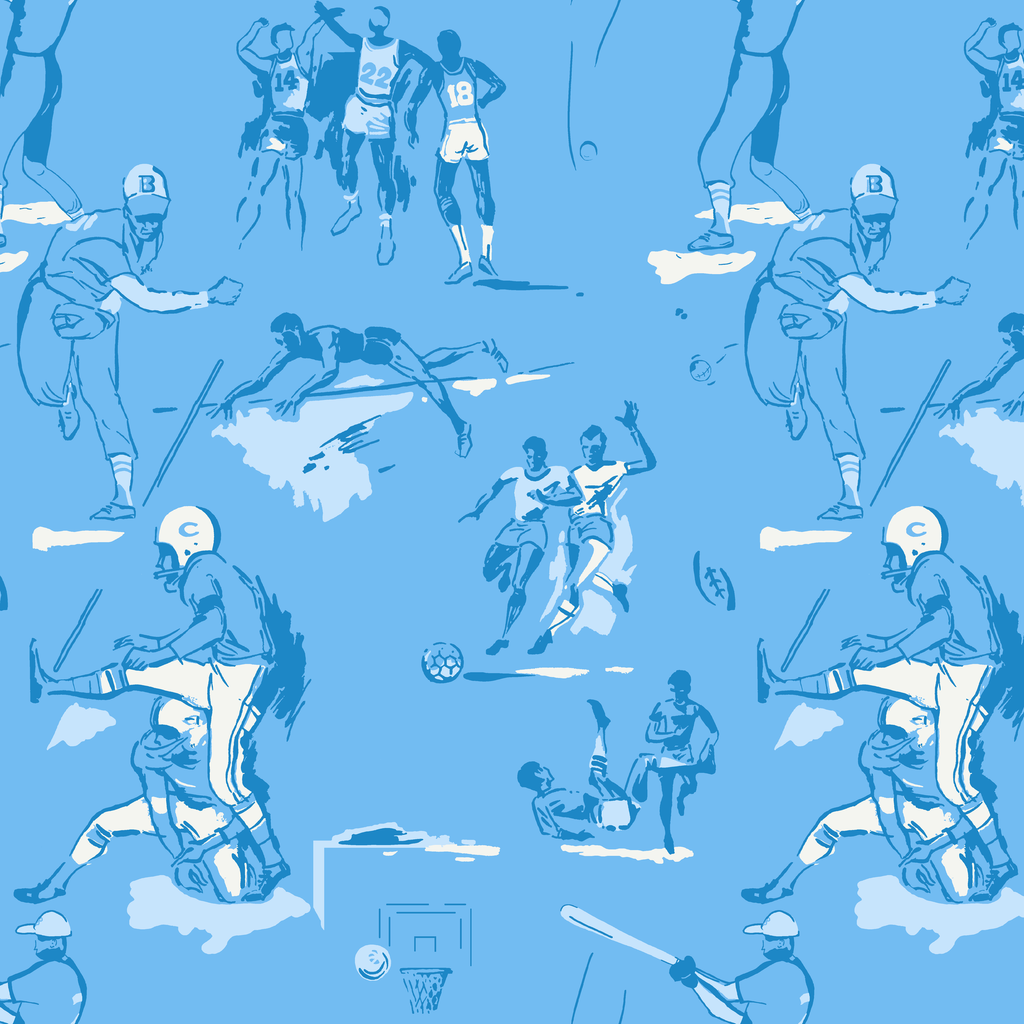 Sporty toile wallpaper on a classic blue background featuring retro illustrations of baseball, football, basketball and soccer players in action. Perfect for sporty spaces and projects.