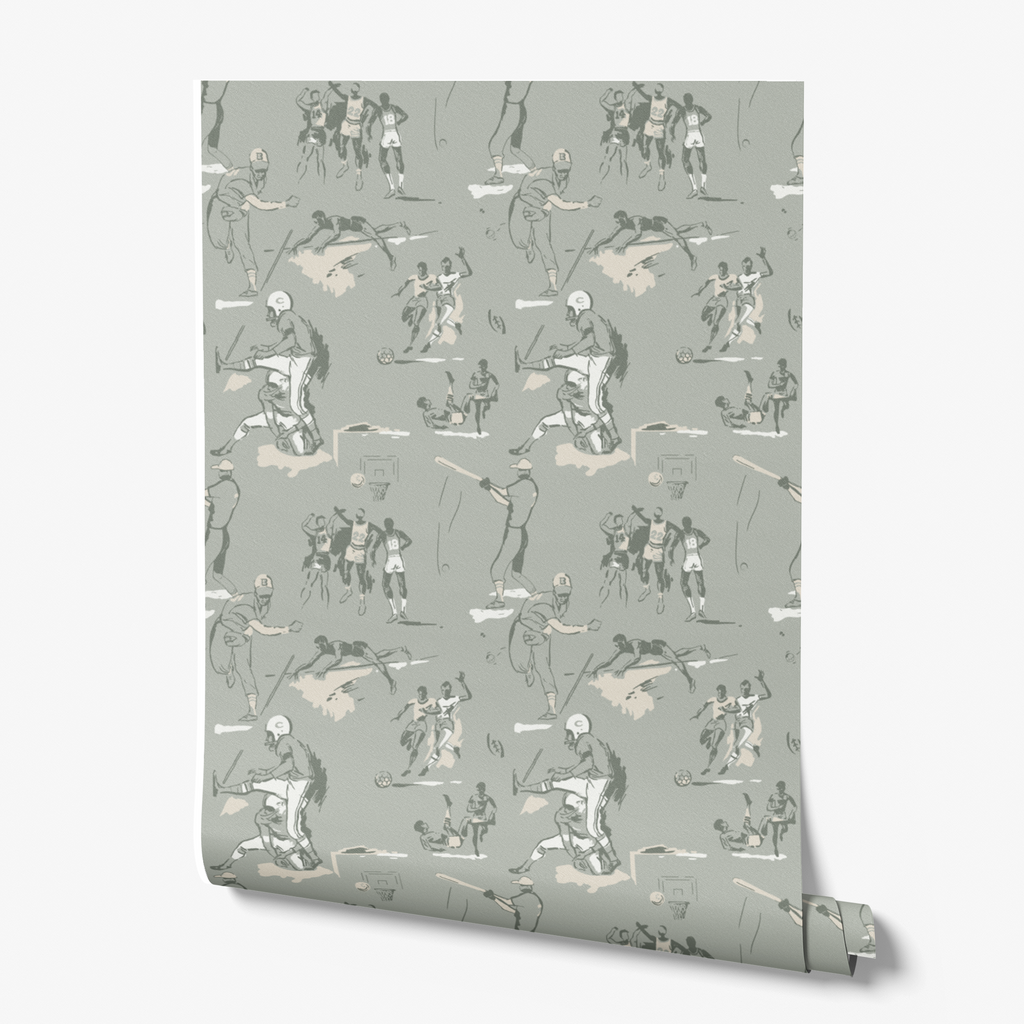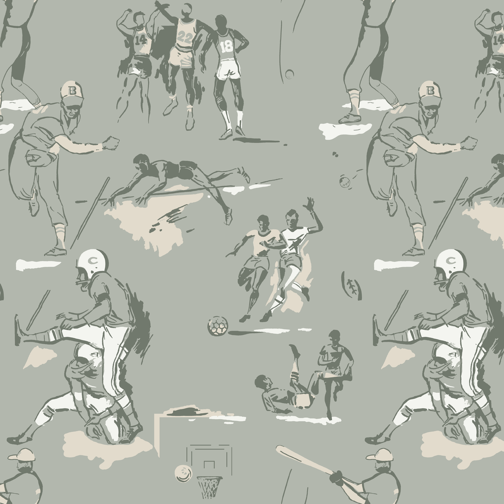 Sporty toile wallpaper on a gray-green background featuring retro illustrations of baseball, football, basketball and soccer players in action. Perfect for sporty spaces and projects.