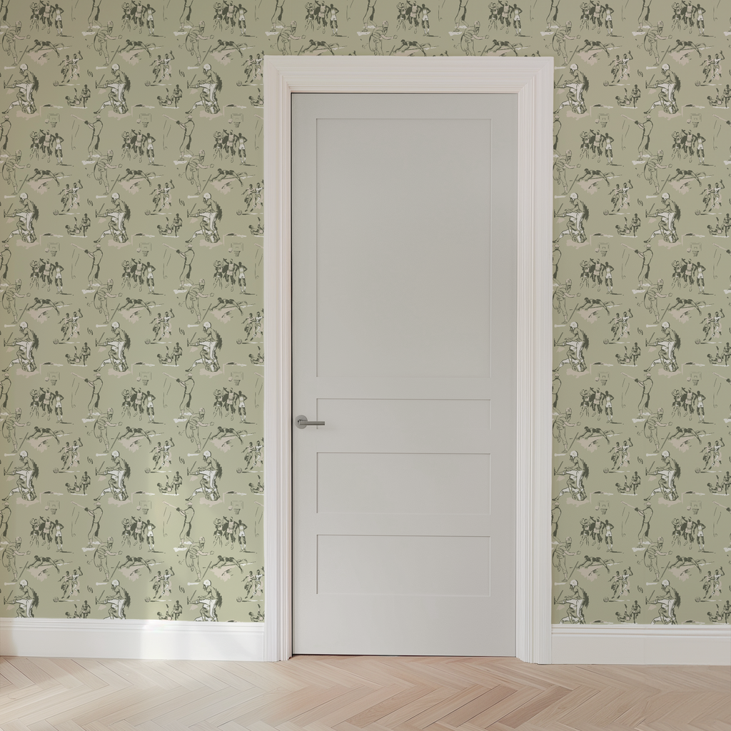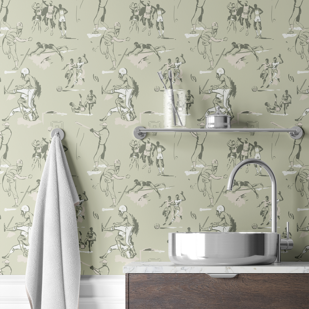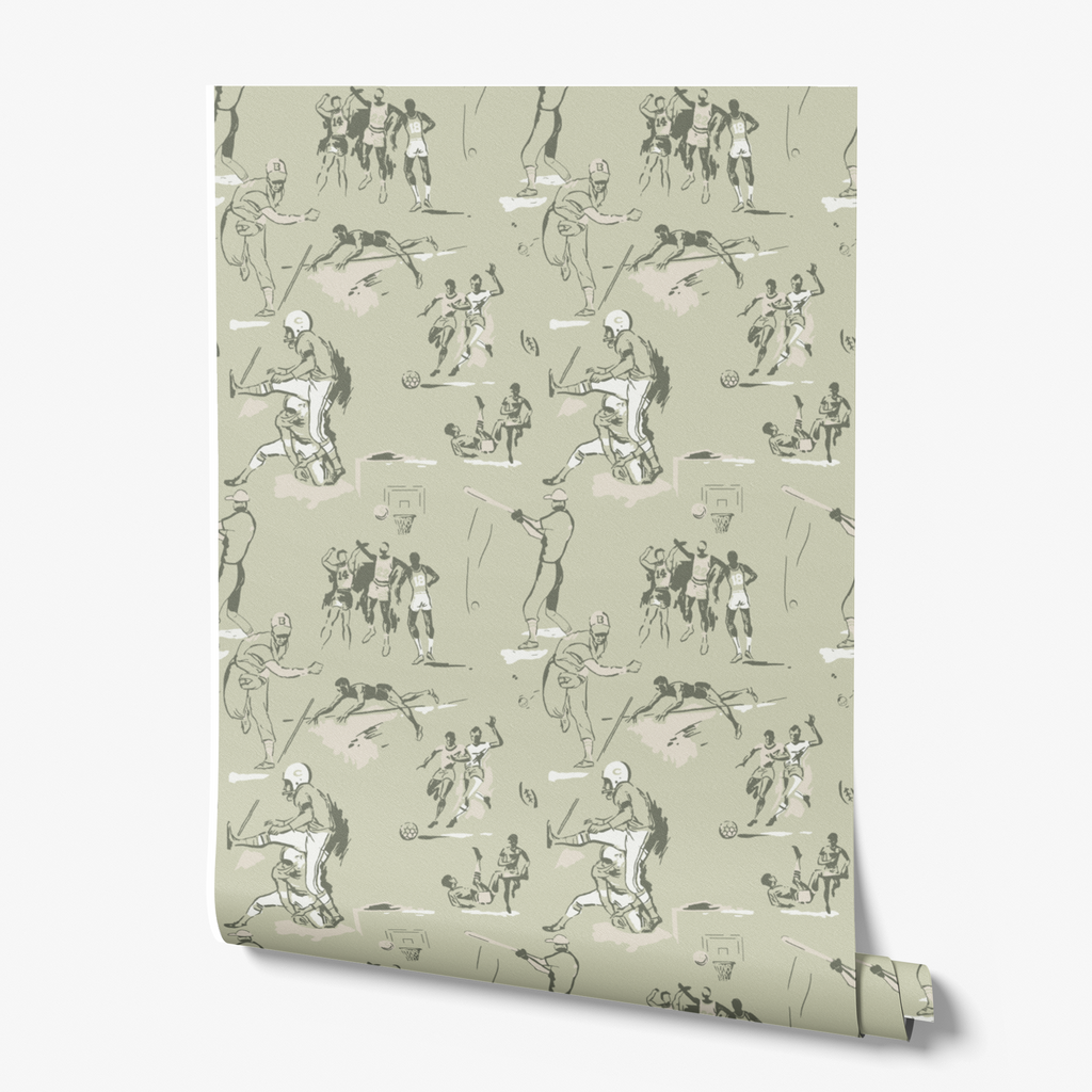 Sporty toile wallpaper on a sage green background featuring retro illustrations of baseball, football, basketball and soccer players in action. Perfect for sporty spaces and projects.