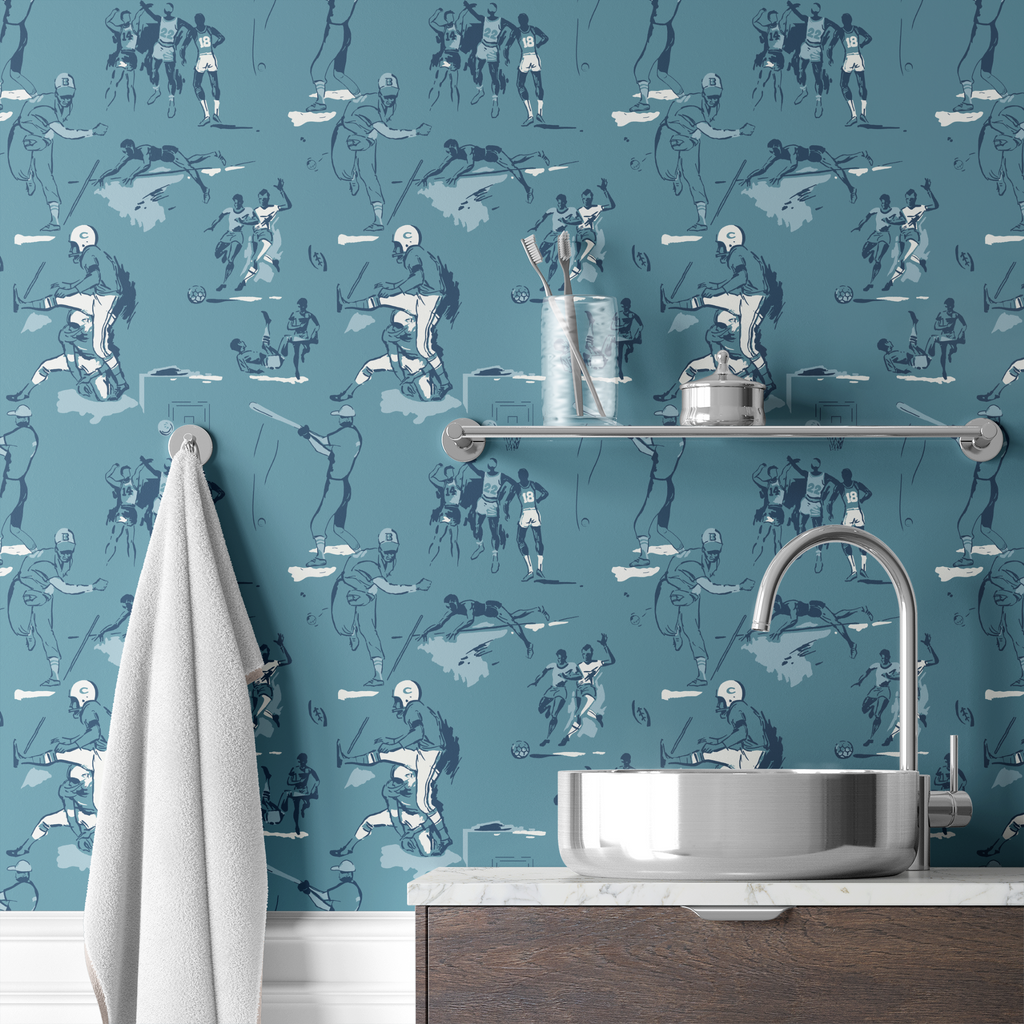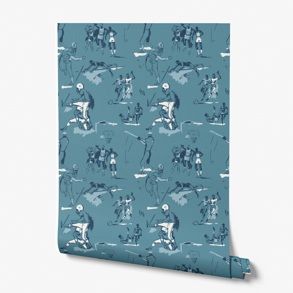Sporty toile wallpaper on a teal blue background featuring retro illustrations of baseball, football, basketball and soccer players in action. Perfect for sporty spaces and projects.