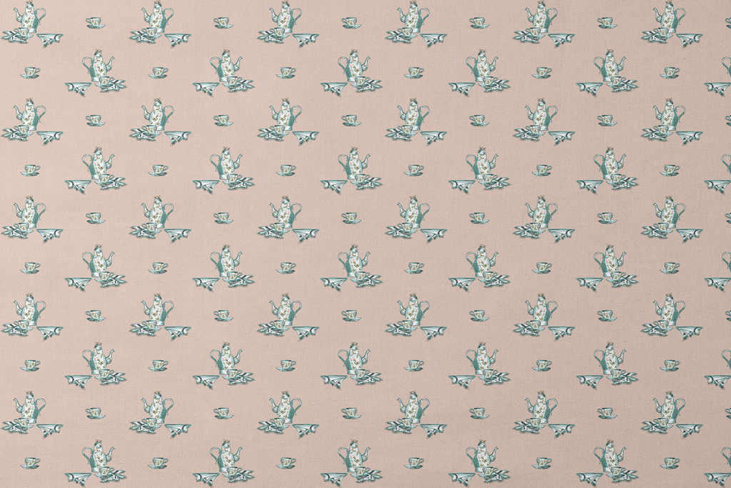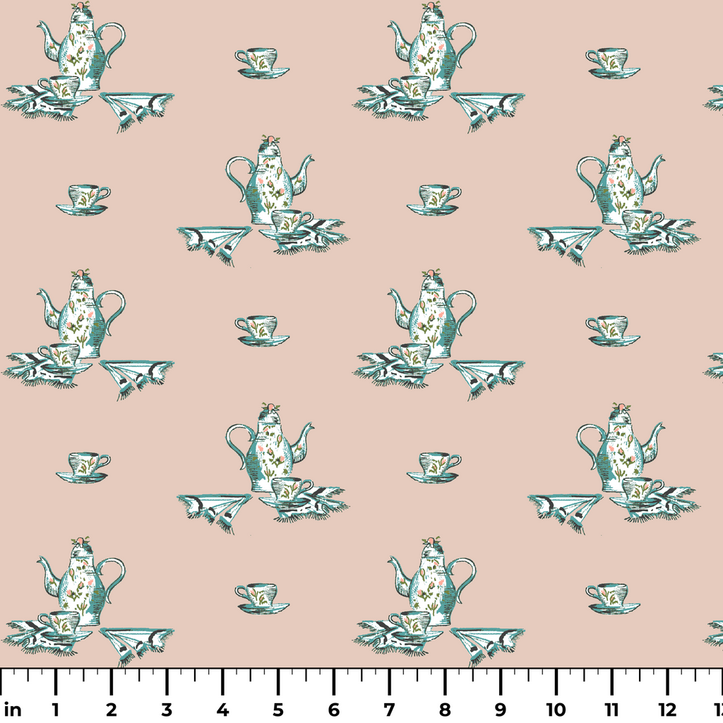 Elegant vintage teapot pattern featuring delicate floral designs on a soft beige background, perfect for creating a charming traditional tea room atmosphere in your home.