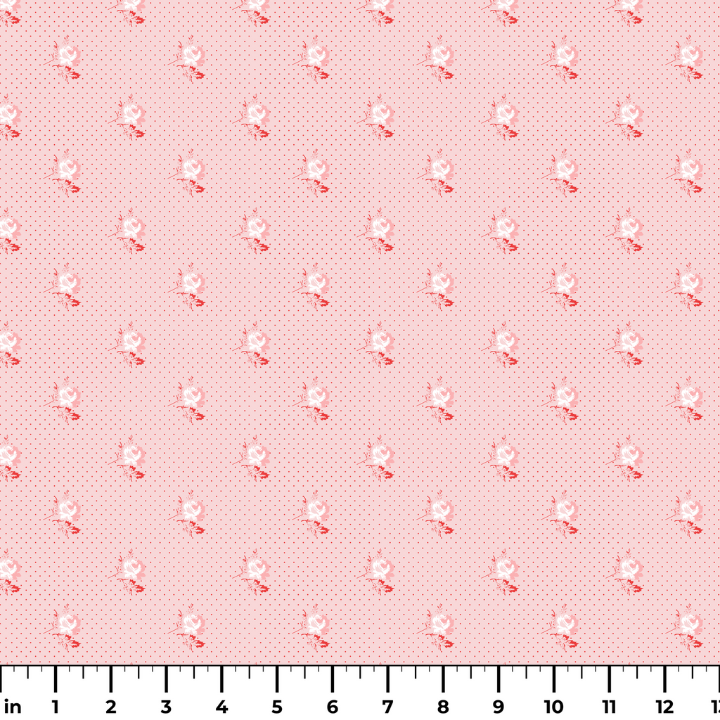 Pink polka dot pattern with romantic red and white roses, perfect for Valentine's Day themed projects with a sweet vintage charm and whimsical cottage aesthetic.