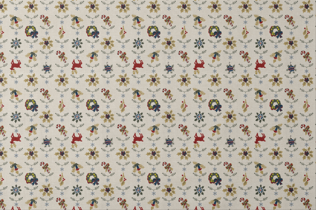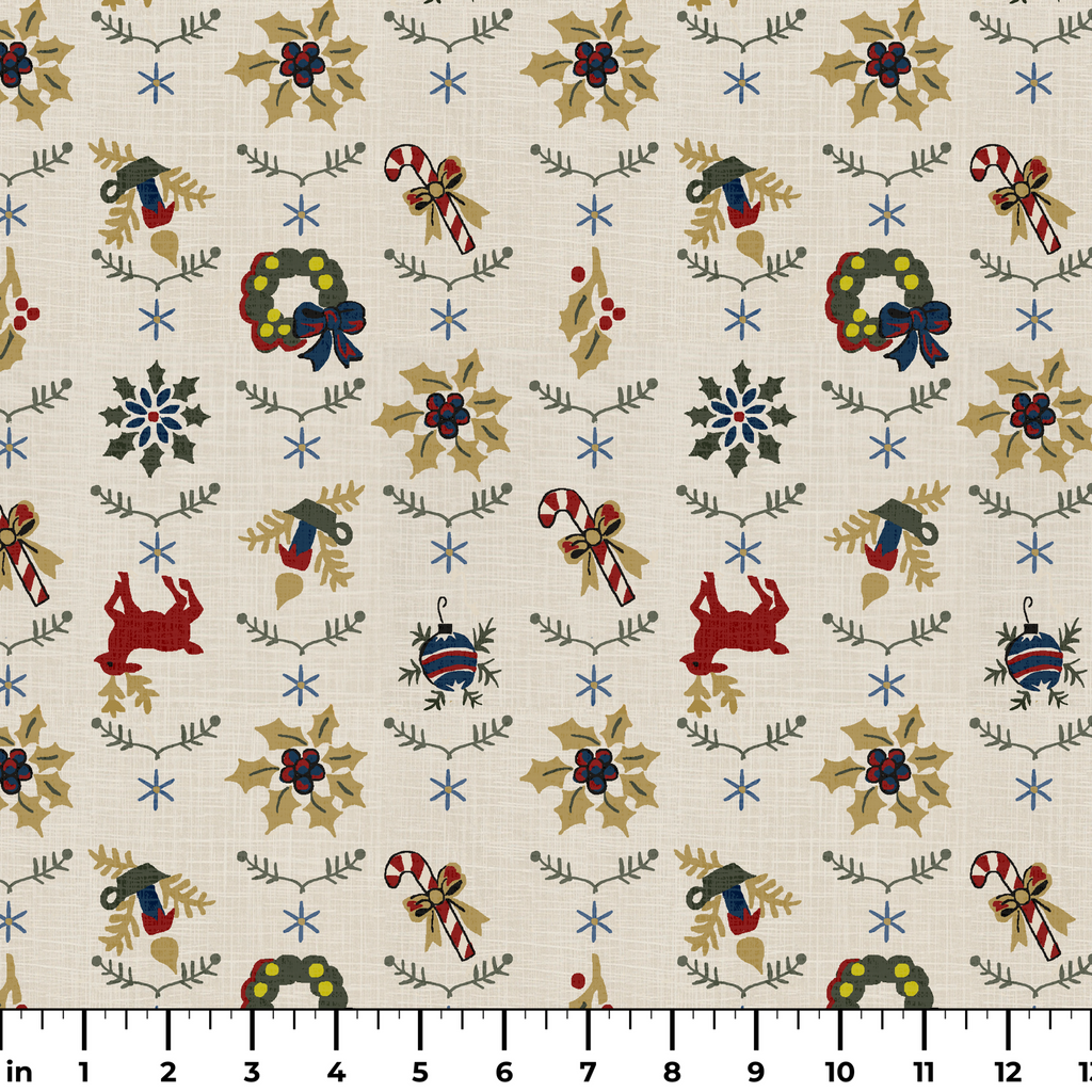 Festive holiday design with traditional Christmas motifs including wreaths, candy canes, and poinsettias on a cream background with delicate greenery and blue snowflakes.