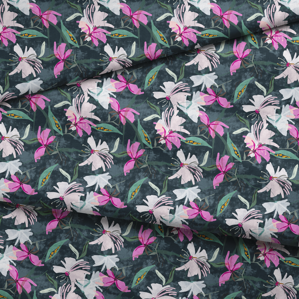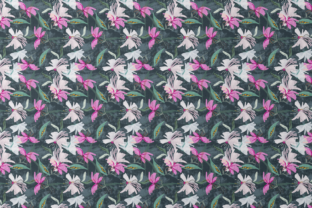 Vibrant watercolor floral pattern featuring pink and white tropical flowers against a dark backdrop with elegant green leaves and golden accents.