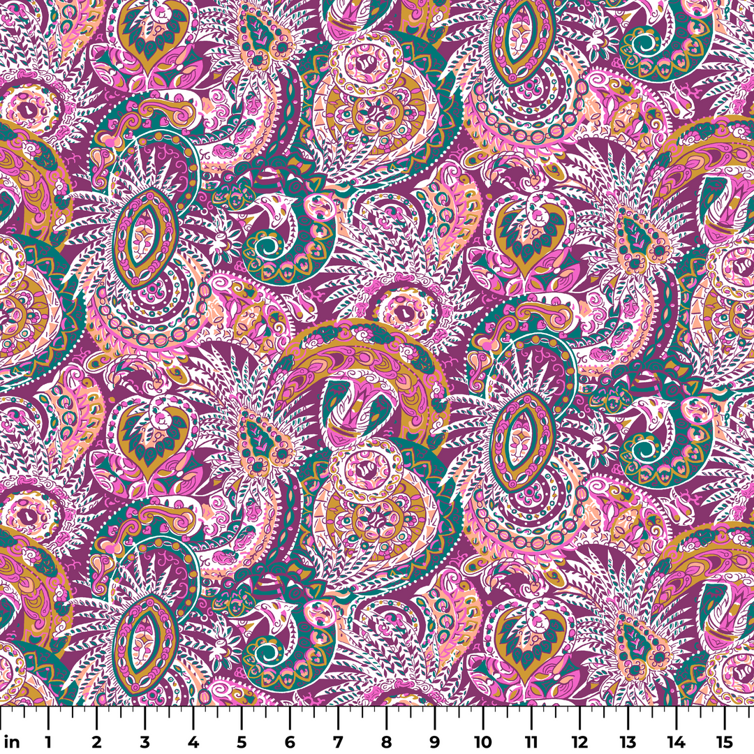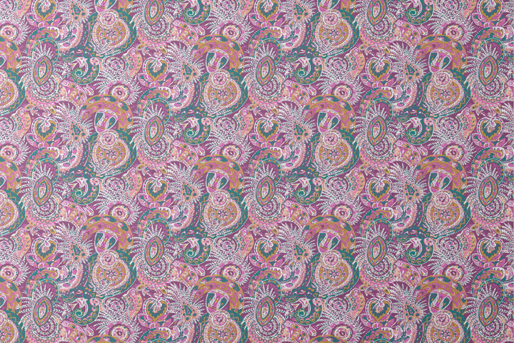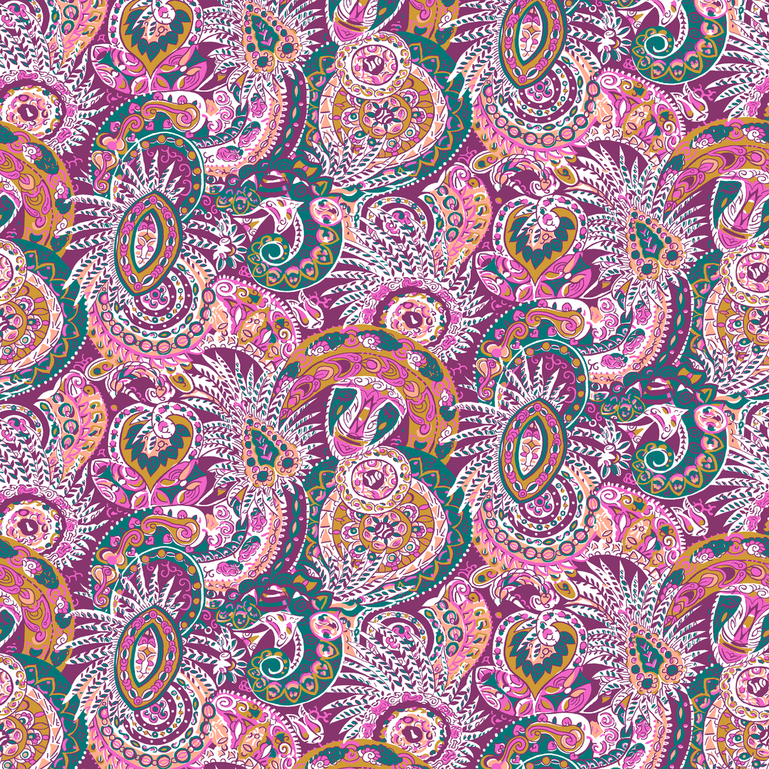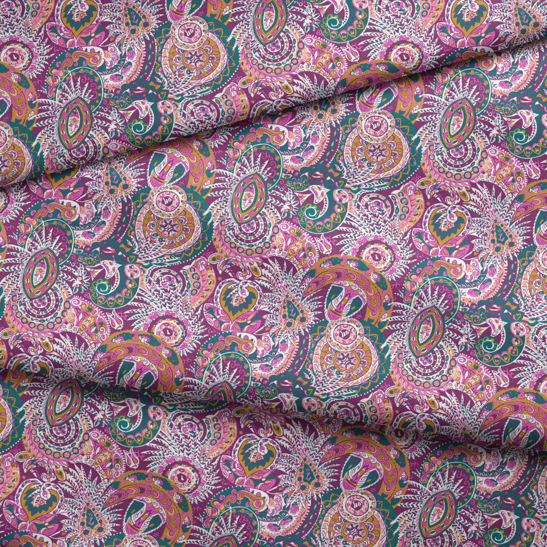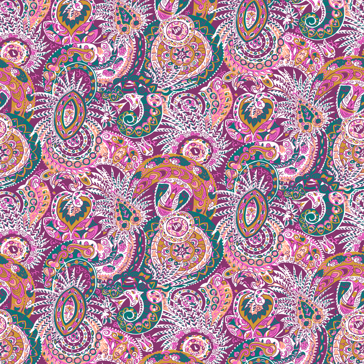 Vibrant paisley design in rich pinks and purples with intricate swirls and organic shapes. This bohemian pattern features ornate details in teal, orange, and white for a classic yet contemporary look.
